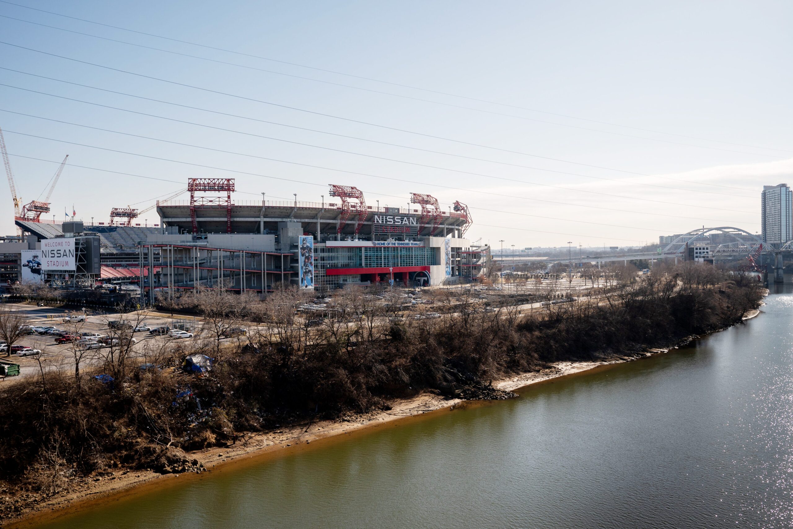 Nissan Stadium is seen behind the East Bank of the Cumberland River in Nashville on Jan. 27, 2025.