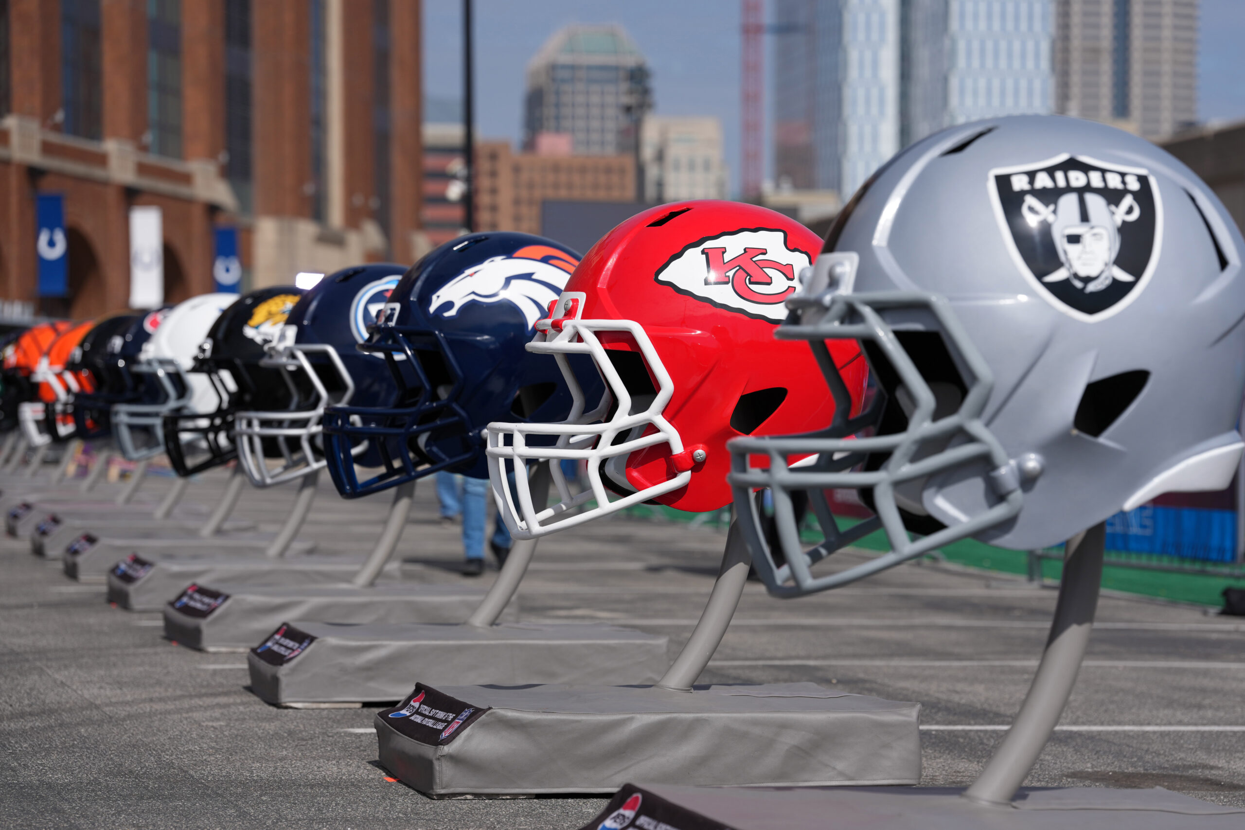 Feb 26, 2026; Indianapolis, IN, USA; Large helmets of the Las Vegas Raiders, Kansas City Chiefs and Denver Broncos at the NFL Scouting Combine at Lucas Oil Stadium. Mandatory Credit: Kirby Lee-Imagn Images