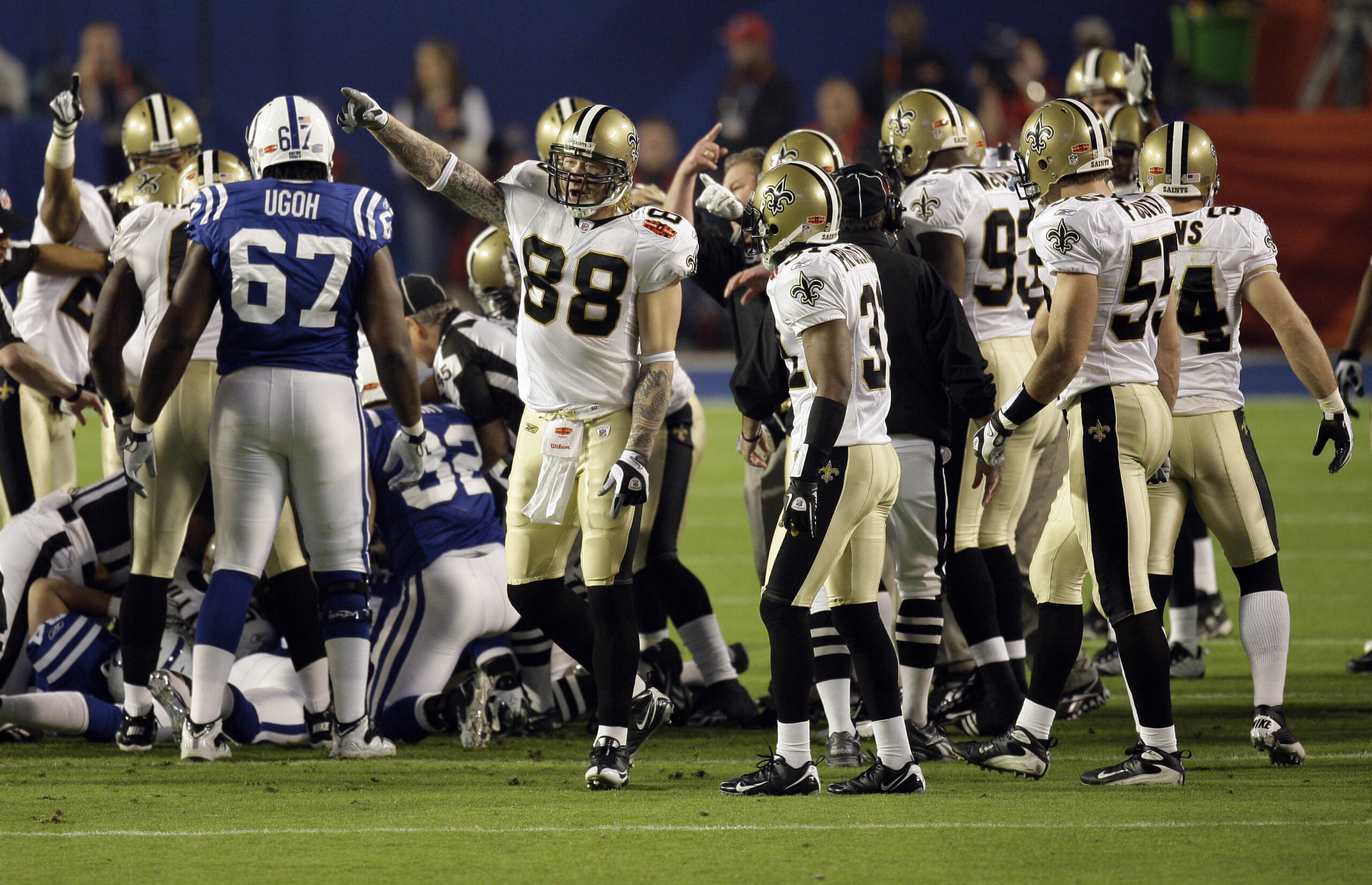 Feb 7, 2010; Miami, FL, USA; New Orleans Saints tight end Jeremy Shockey (88) celebrates after an on-sides kick recovery during the third quarter of Super Bowl XLIV against the Indianapolis Colts at Sun Life Stadium. Mandatory Credit: Jeff Hanisch-Imagn Images