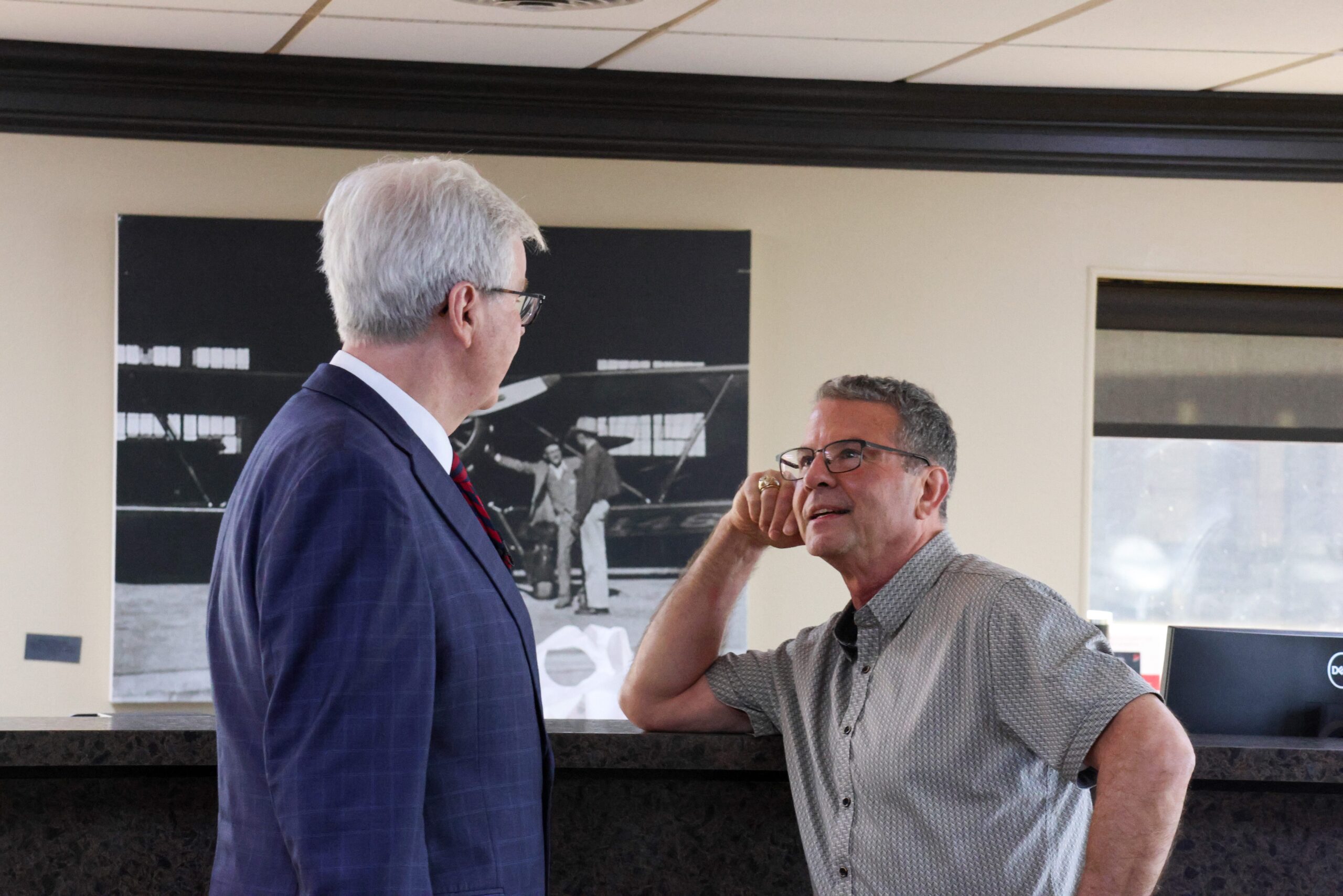 Texas Lt. Gov. Dan Patrick talks Sen. Charles Perry before a news conference as the Patrick makes a quick stop in Lubbock, Texas to discuss wins for the West Texas region from the 89th Session of the Texas Legislature on June 6, 2025.