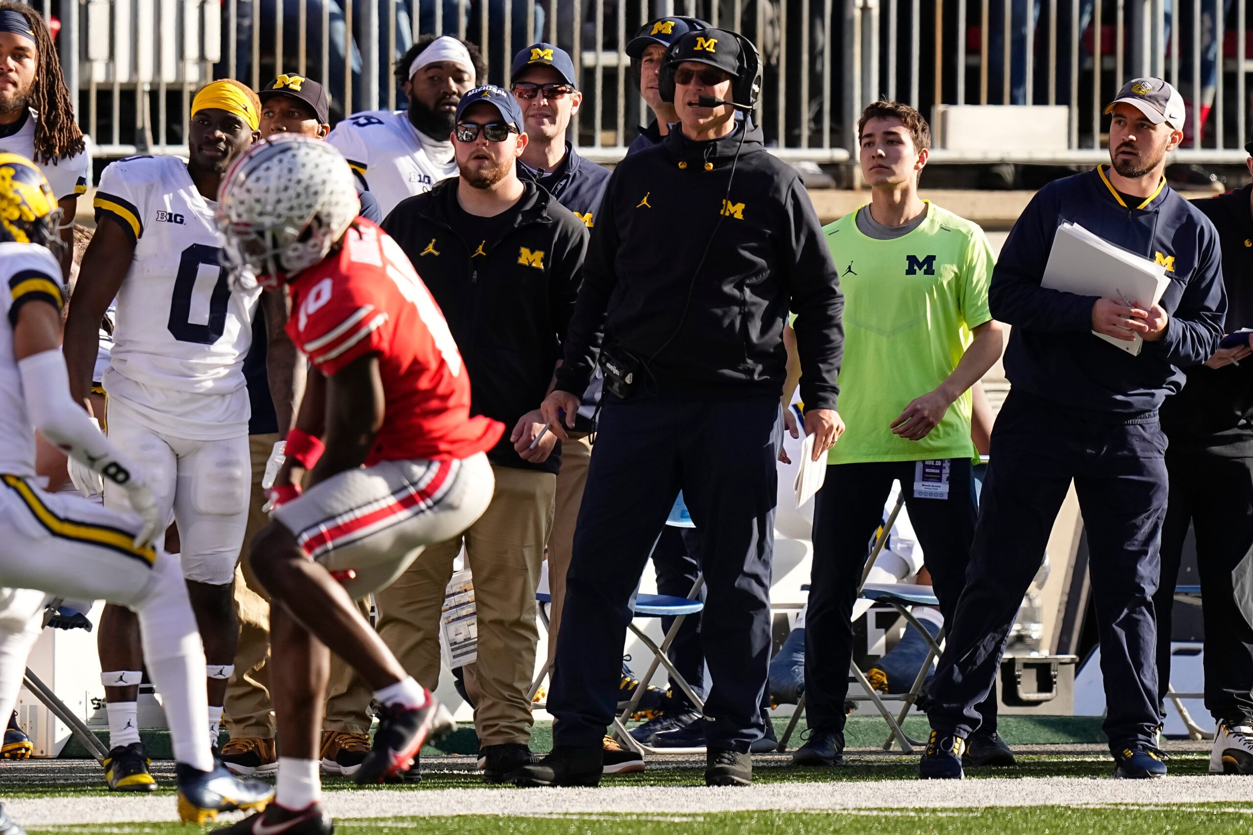 Michigan Wolverines head coach Jim Harbaugh watches from the sideline beside off-field analyst Connor Stalions, right, during the NCAA football game against the Ohio State Buckeyes at Ohio Stadium.