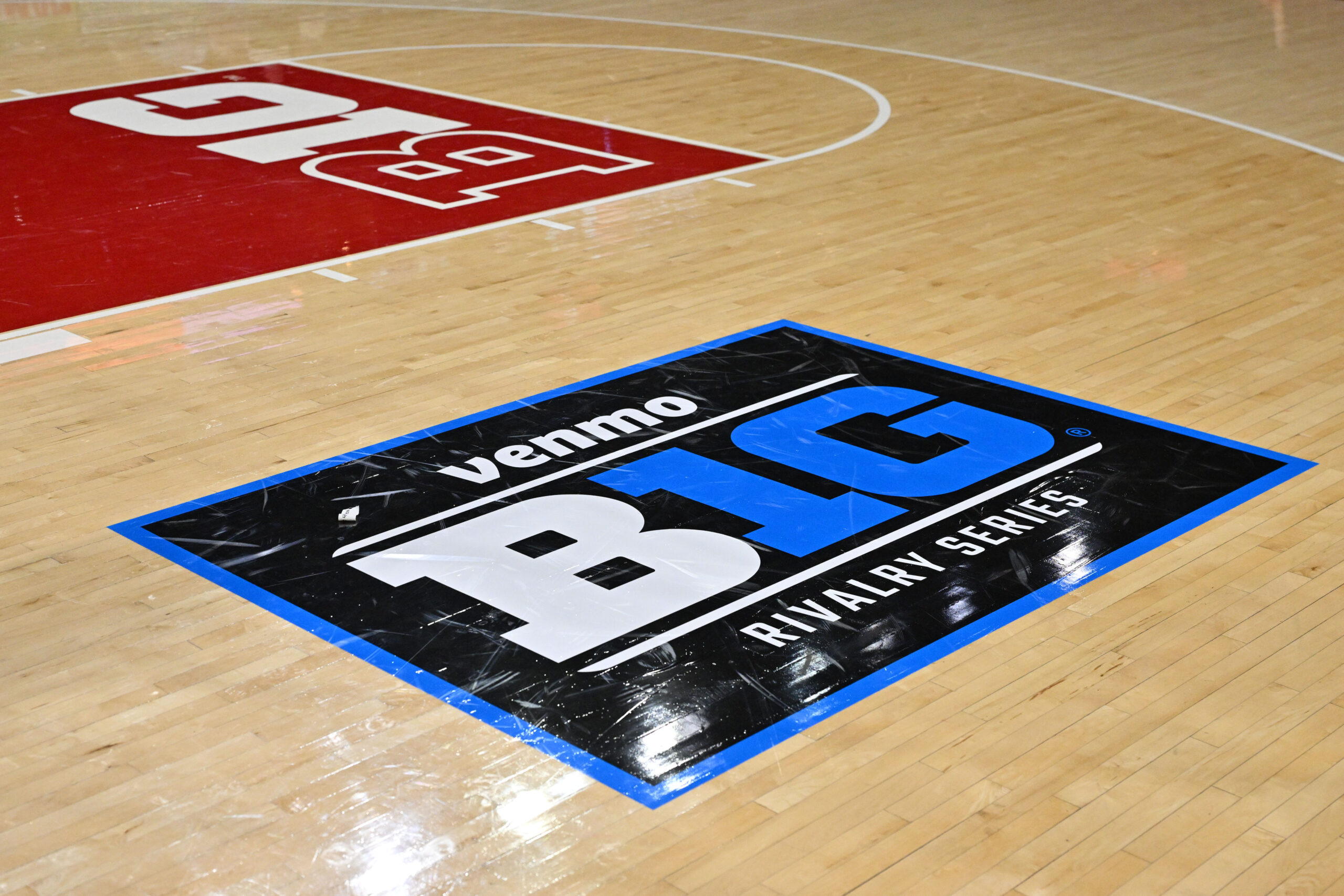 Feb 11, 2026; College Park, Maryland, USA; A general view of Big Ten Conference signage on the court before a game between the Iowa Hawkeyes and the Maryland Terrapins at Xfinity Center. Mandatory Credit: Jamie Sabau-Imagn Images