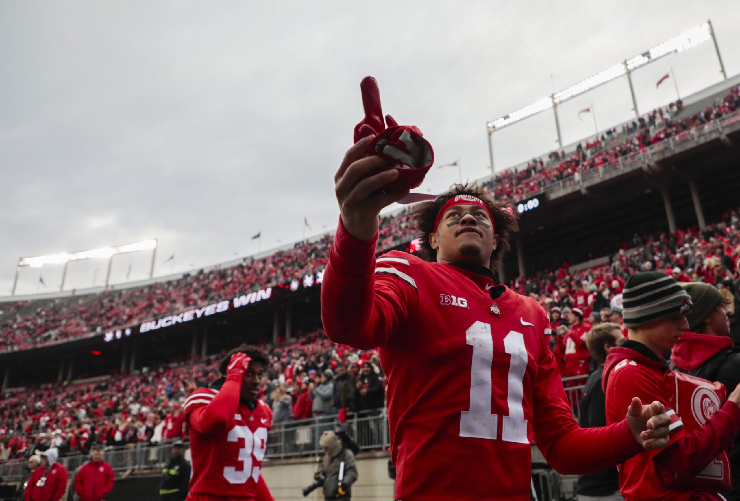 Ohio State Buckeyes wide receiver Jaxon Smith-Njigba (11) hands a glove to a fan following the Buckeyes’ 56-7 victory against the Michigan State Spartans in a NCAA Division I football game at Ohio Stadium.