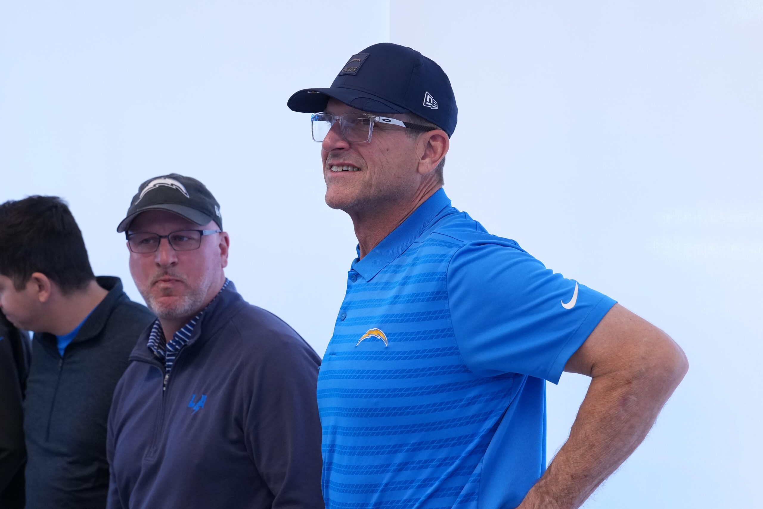 January 27, 2026; El Segundo, California, USA; Los Angeles Chargers coach Jim Harbaugh (right) and general manager Joe Hortiz attend introductory press conference for offensive coordinator Mike McDaniel at The Bolt. Mandatory Credit: Kirby Lee-Imagn Images