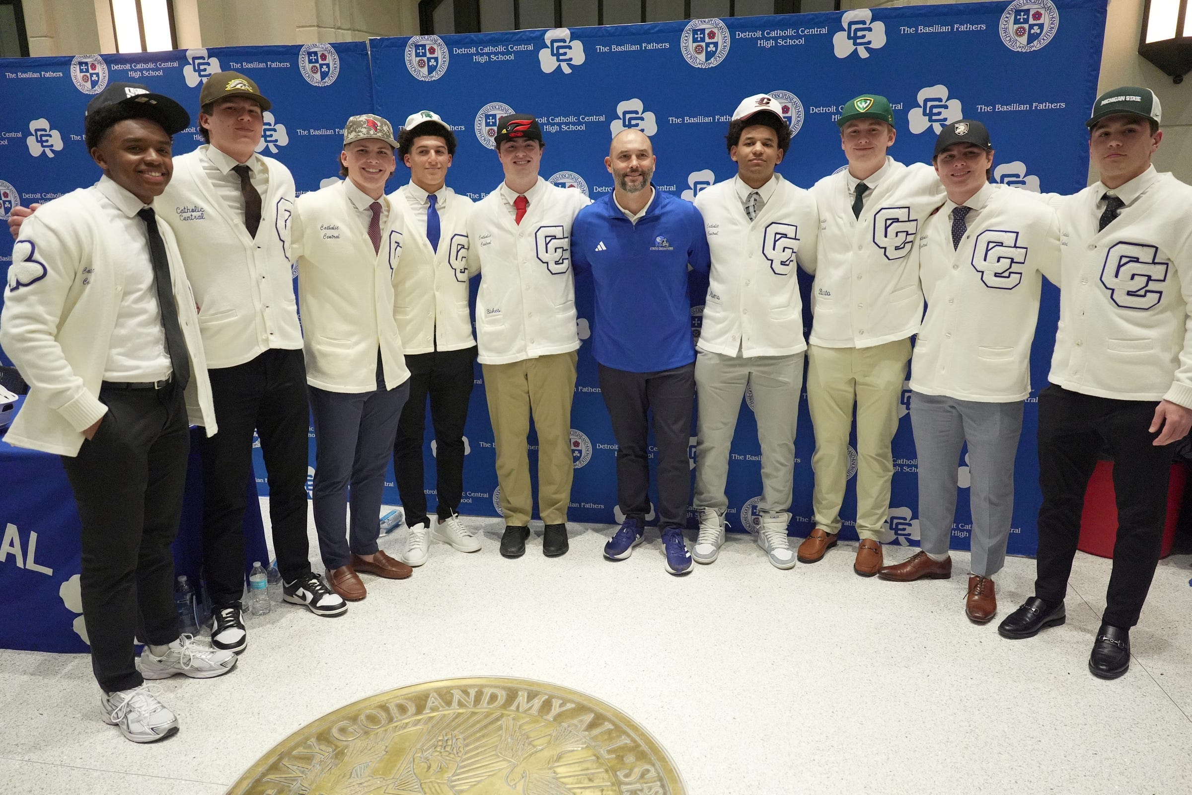 Novi Detroit Catholic Central football players, like WR Samson Gash who signed with Michigan State University Football, pose for photo with Catholic Central coach Justin Cessante during signing day in the Hall of Science in Novi, Wednesday, February 4, 2026.
