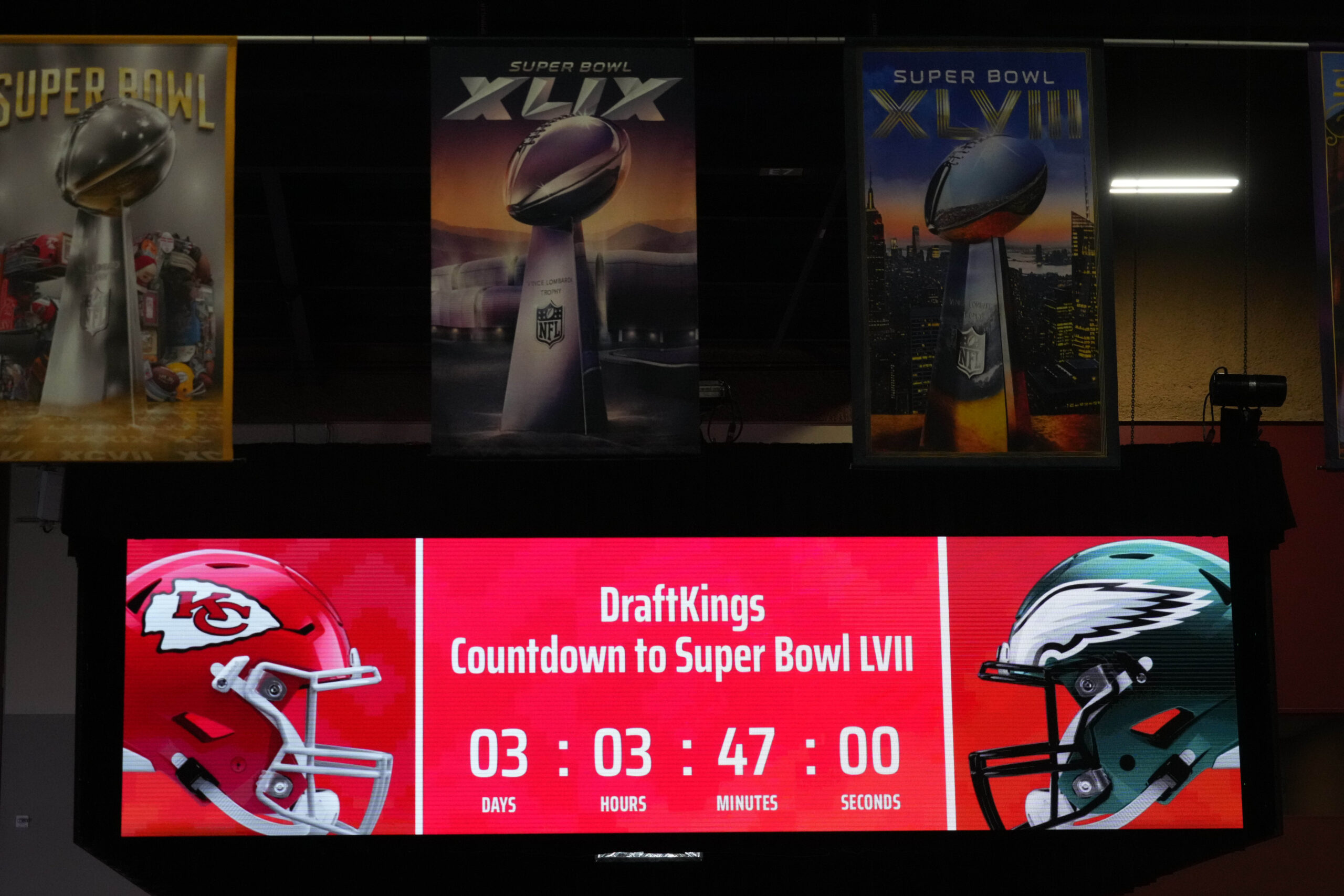 Feb 9, 2023; Phoenix, AZ, USA; A DraftKings countdown clock on radio row at the Super Bowl LVII media center at the Phoenix Convention Center. Mandatory Credit: Kirby Lee-Imagn Images