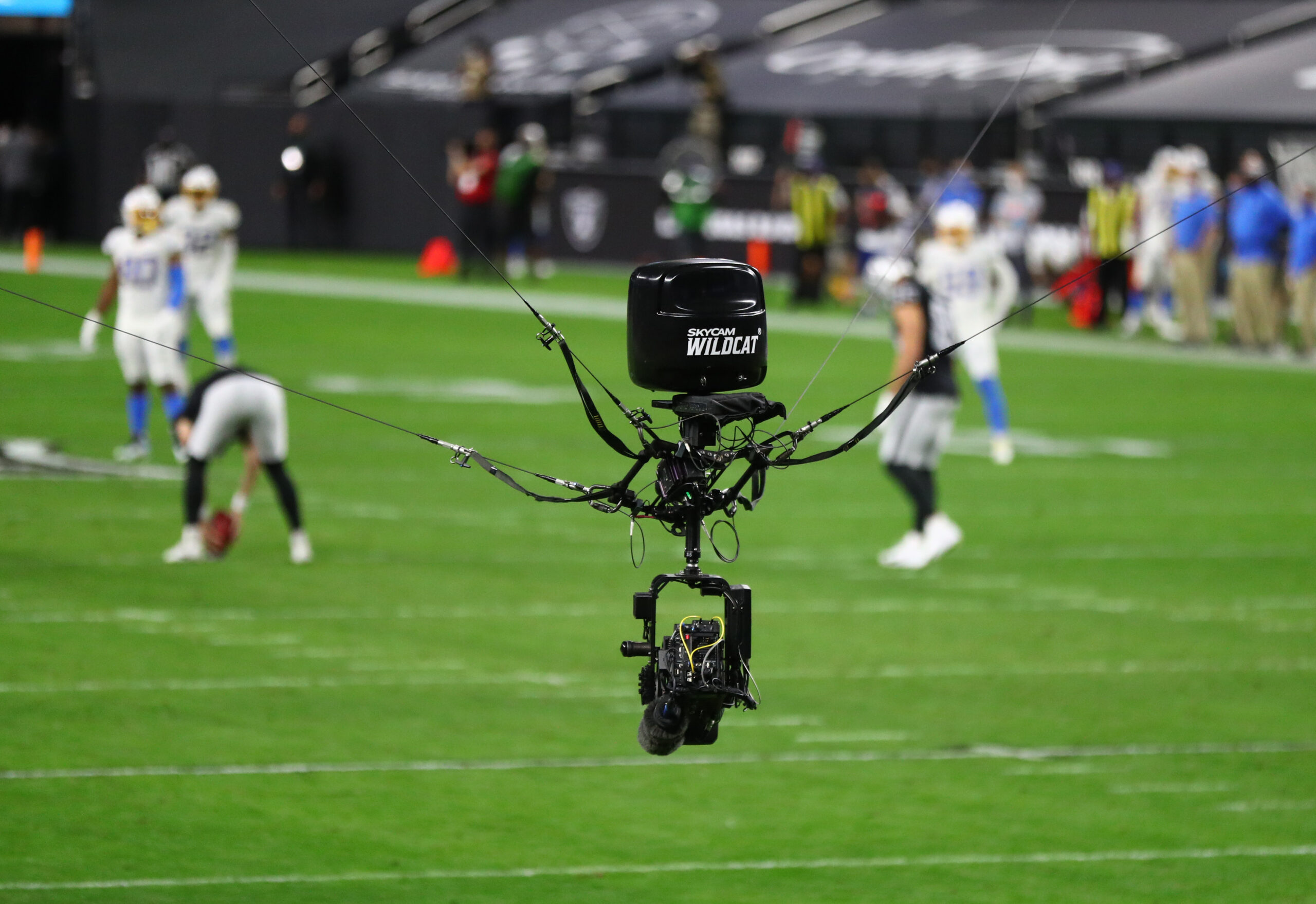 Dec 17, 2020; Paradise, Nevada, USA; Detaioed view of the Wildcat Skycam television camera over the Las Vegas Raiders game against the Los Angeles Chargers at Allegiant Stadium. Mandatory Credit: Mark J. Rebilas-Imagn Images