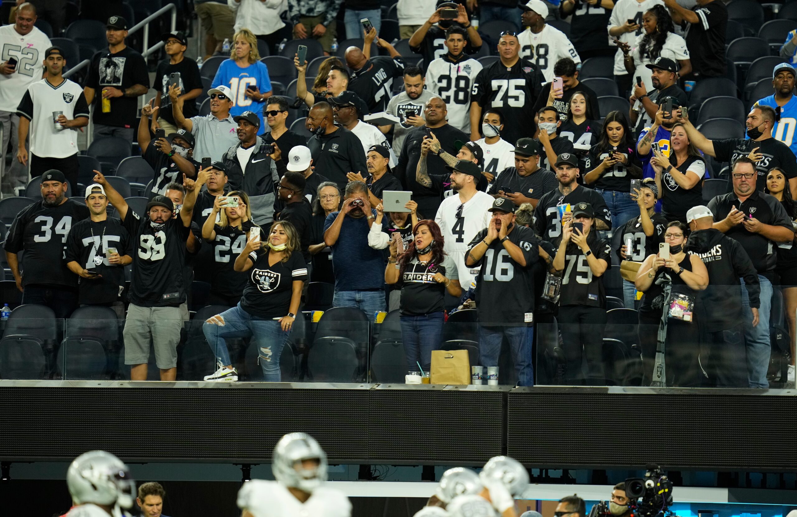 Oct 4, 2021; Inglewood, California, USA; Las Vegas Raiders fans pack SoFi Stadium for the Monday Night Football game against the hometown Los Angeles Chargers. Mandatory Credit: Robert Hanashiro-Imagn Images