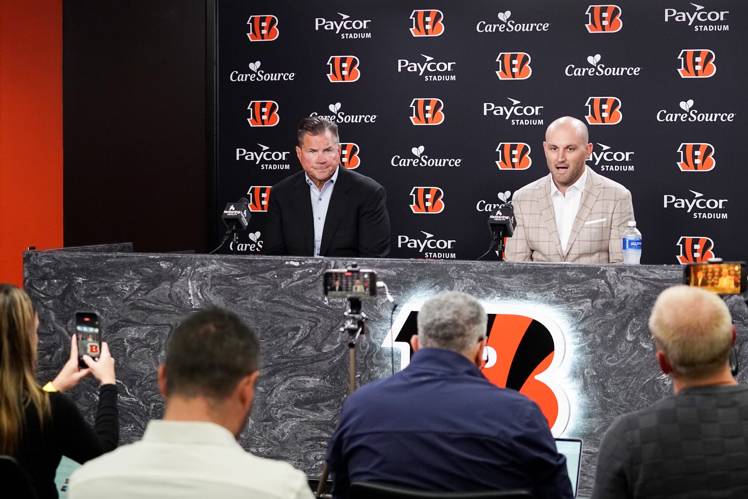 Cincinnati Bengals Defensive Coodinator Al Golden, left, and Assistant General Manager Mike Potts, right, speak with media during the 2026 NFL Draft, Friday, April 24, 2026, at Paycor Stadium in downtown Cincinnati.
