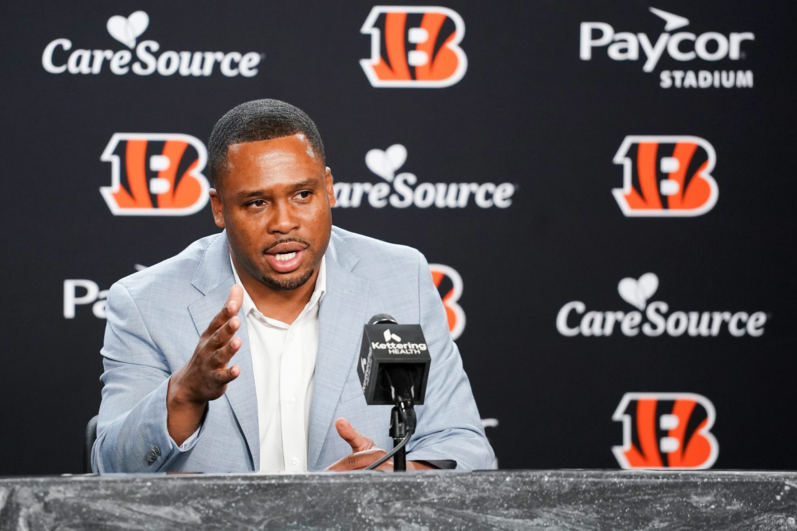 Cincinnati Bengals Assistant General Manager Trey Brown speaks with media at a press conference during the 2026 NFL Draft, Friday, April 24, 2026, at Paycor Stadium in downtown Cincinnati.