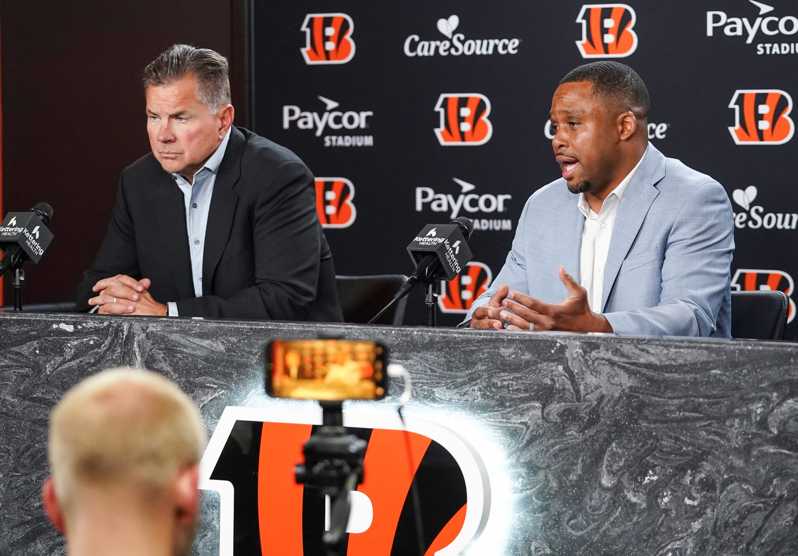 Cincinnati Bengals Defensive Coordinator Al Golden, left, and Assistant General Manager Trey Brown speak to media during the 2026 NFL Draft, Friday, April 24, 2026, at Paycor Stadium in downtown Cincinnati.