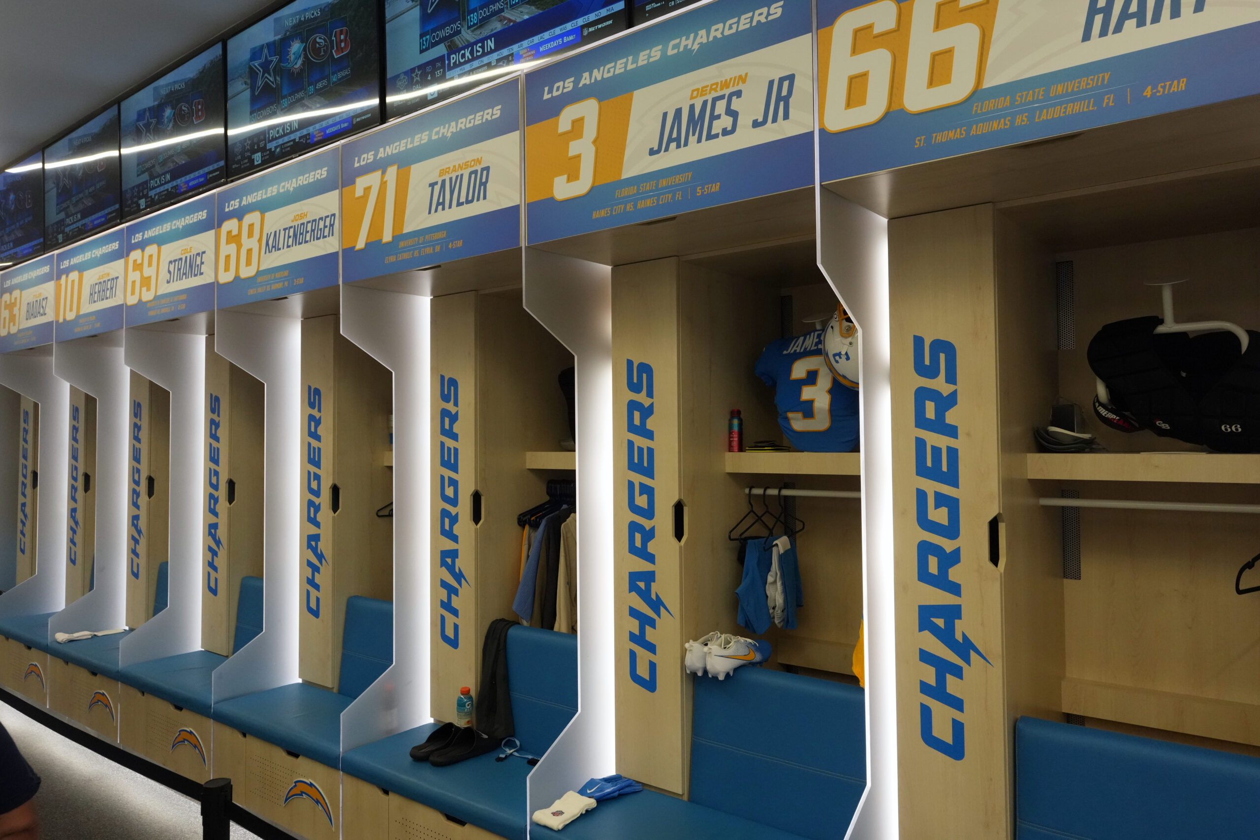 Apr 25, 2026; El Segundo, CA, USA; The lockers of Los Angeles Chargers quarterback Justin Herbert (10), guard Cole Strange (69), center Josh Kaltenberger (68), guard Branson Taylor (71) and safety Derwin James. Jr. (3) at The Bolt. Mandatory Credit: Kirby Lee-Imagn Images