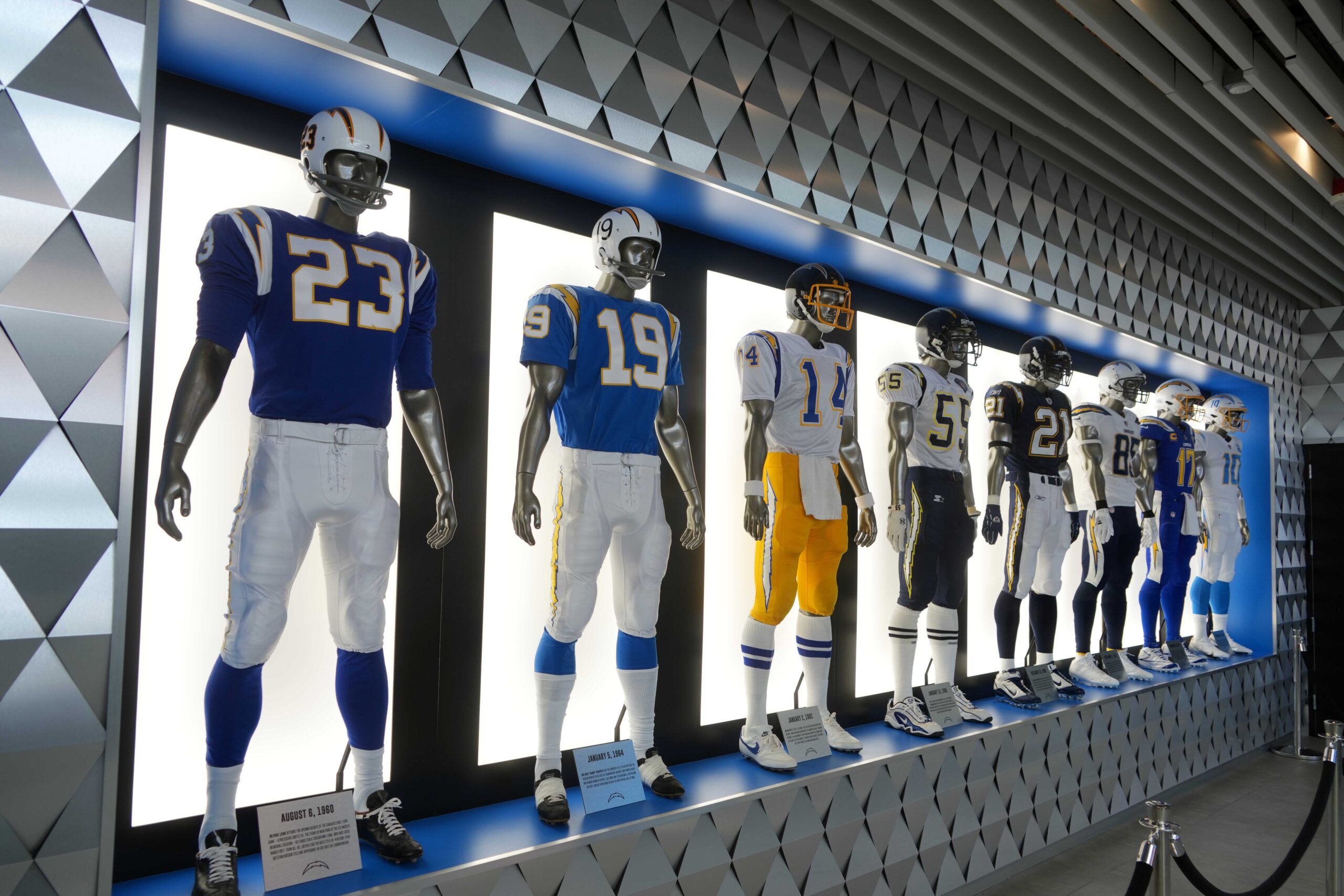 Apr 25, 2026; El Segundo, CA, USA; The uniforms and helmets of San Diego and Los Angeles Chargers players, Paul Lowe (23), Lance Alworth (19), Dan Fouts (14), Junior Seau (55), LaDainian Tomlinson (21), Antonio Gates (85), Philip Rivers (17) and Justin Herbert (10) at The Bolt. Mandatory Credit: Kirby Lee-Imagn Images