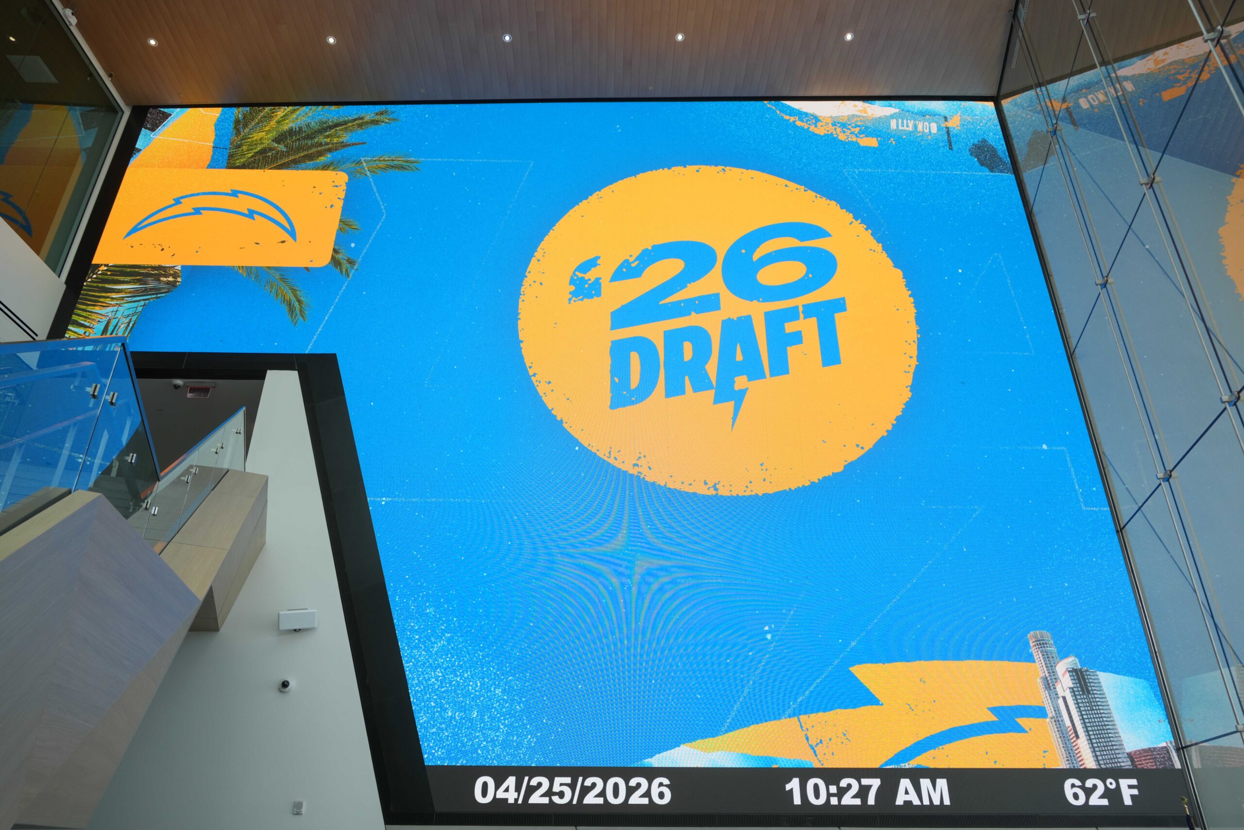 Apr 25, 2026; El Segundo, CA, USA; The Los Angeles Chargers logo on a video board in the lobby of The Bolt. Mandatory Credit: Kirby Lee-Imagn Images