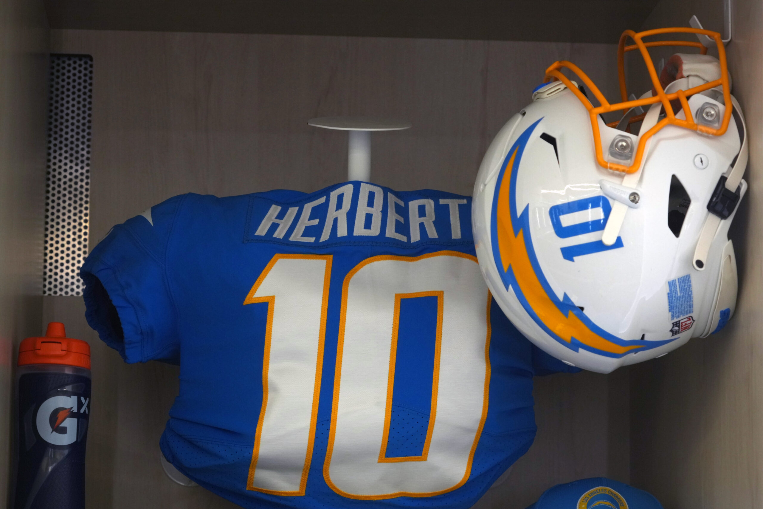 Apr 25, 2026; El Segundo, CA, USA; The jersey and helmet of Los Angeles Chargers quarterback Justin Herbert in the locker room at The Bolt. Mandatory Credit: Kirby Lee-Imagn Images