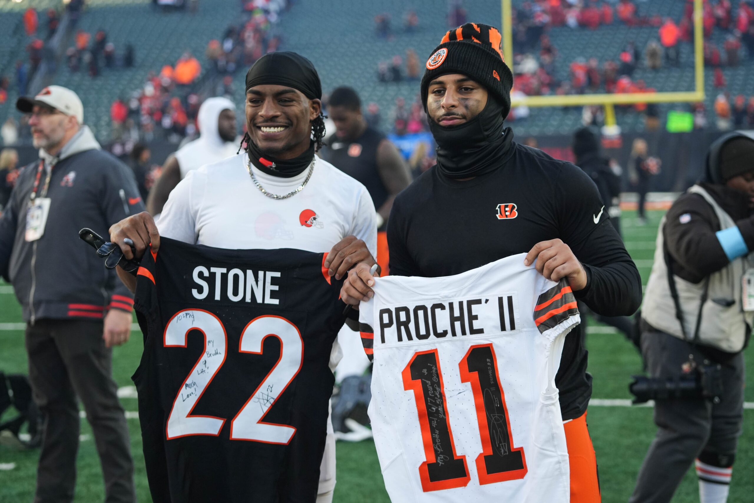 The Bengals and Browns meet up after the game to talk, swap jerseys, pray and celebrate at Paycor Stadium on Sunday December 22, 2024. The Bengals won the game with a final score of 24-6.