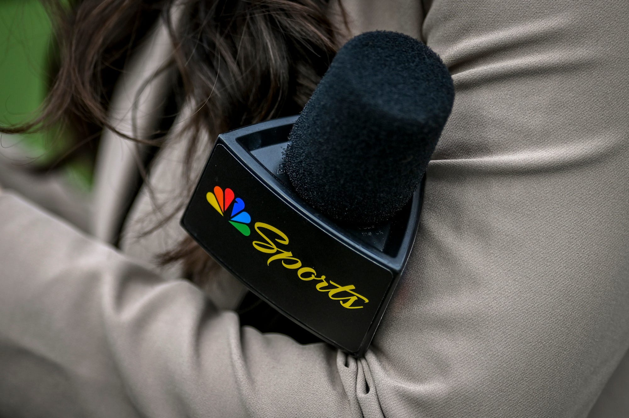 A Peacock sideline reporter holds a microphone with the NBC Peacock logo during Michigan State’s football game against Washington on Saturday, Sept. 16, 2023 at Spartan Stadium in East Lansing, Michigan.