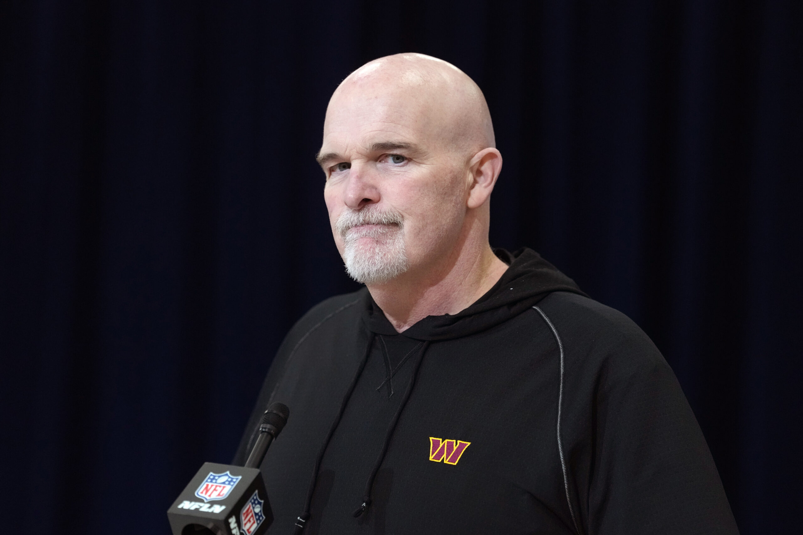 Feb 24, 2026; Indianapolis, IN, USA; Washington Commanders coach Dan Quinn speaks at the NFL Scouting Combine at the Indiana Convention Center. Mandatory Credit: Kirby Lee-Imagn Images