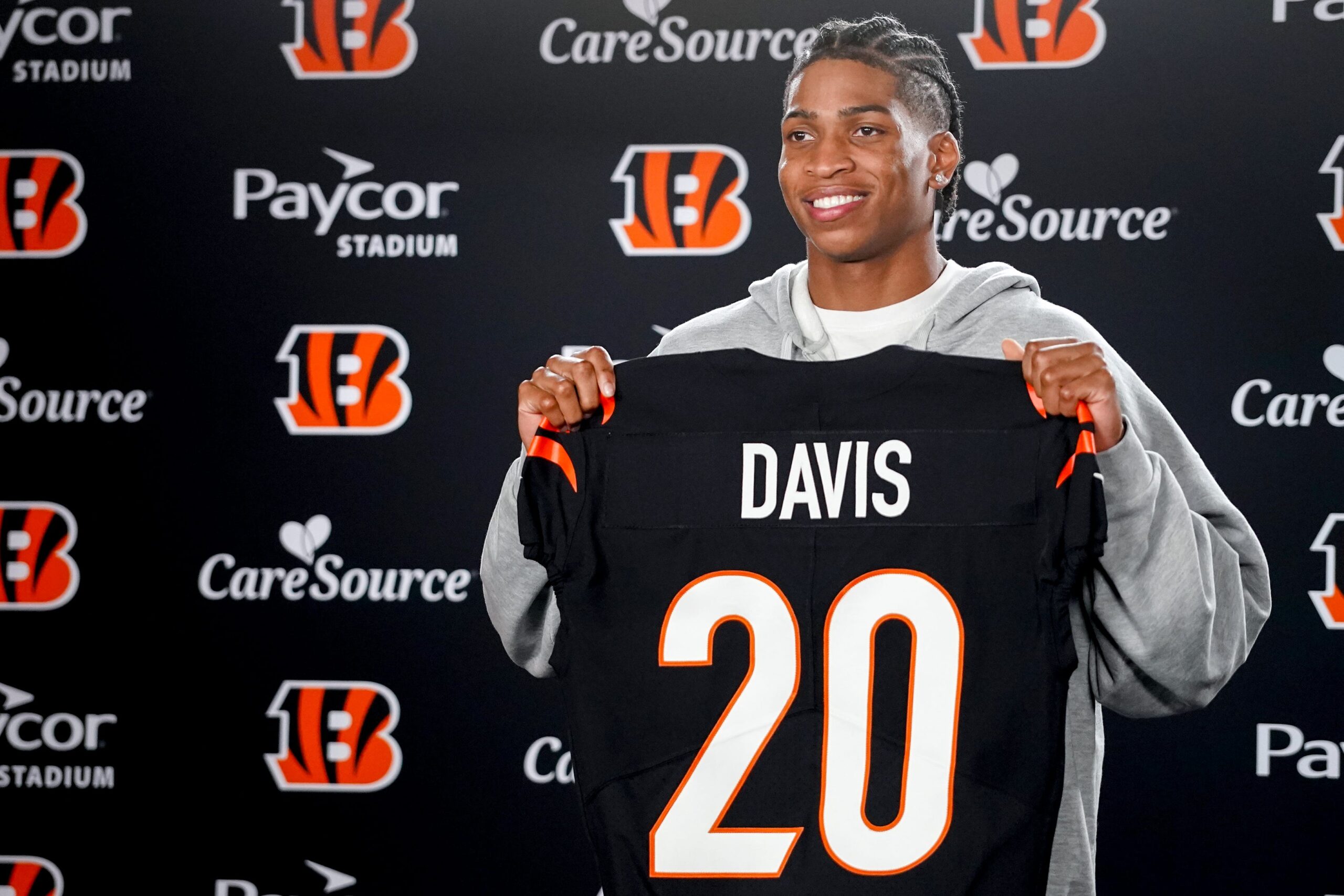 Cincinnati Bengals third round pick Tacario Davis holds his jersey at a press conference during the 2026 NFL Draft, Saturday, April 25, 2026, at Paycor Stadium in downtown Cincinnati.