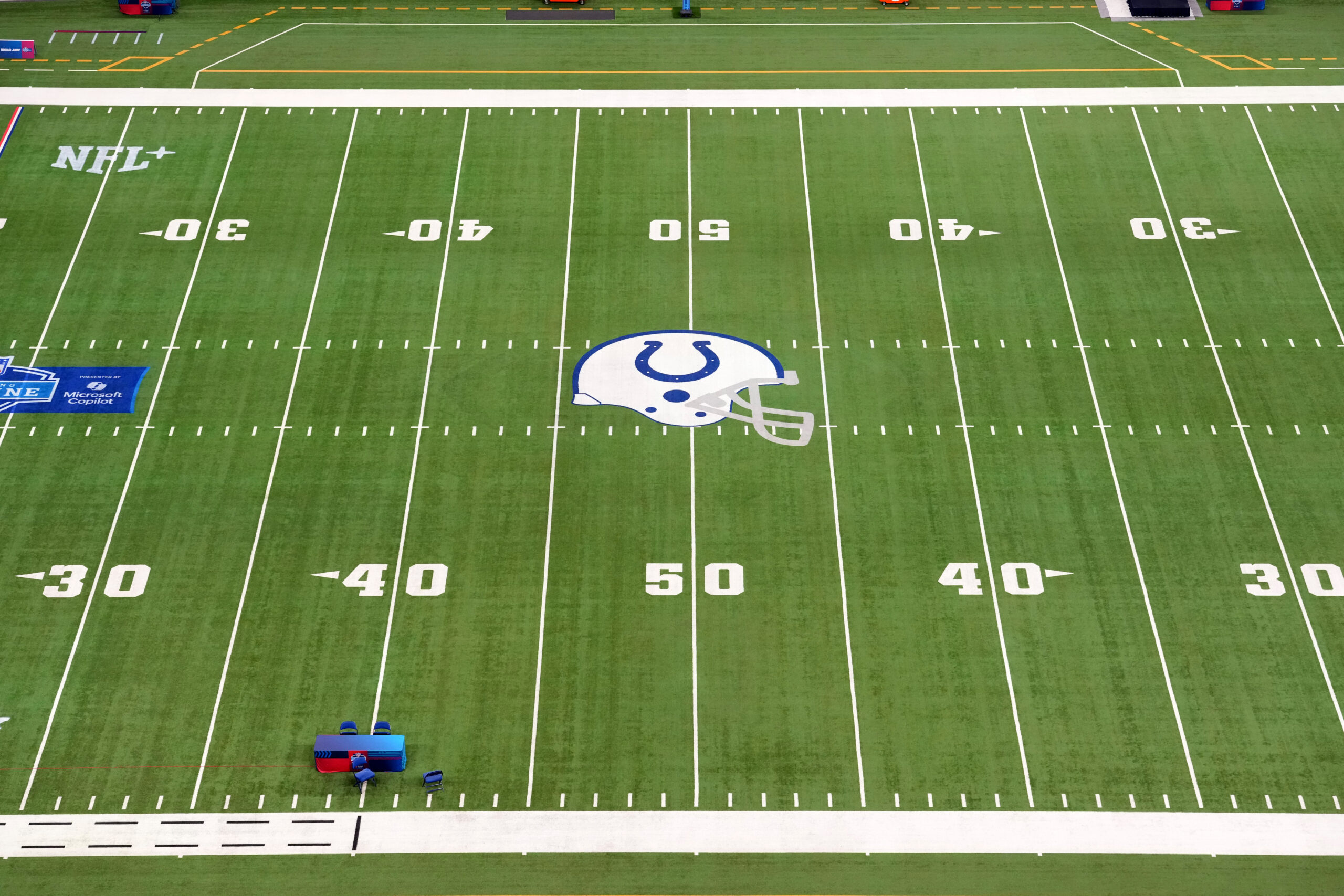 Feb 24, 2026; Indianapolis, IN, USA; The Indianapolis Colts helmet logo at midfield of Lucas Oil Stadium, the site of the 2026 NFL Scouting Combine. Mandatory Credit: Kirby Lee-Imagn Images