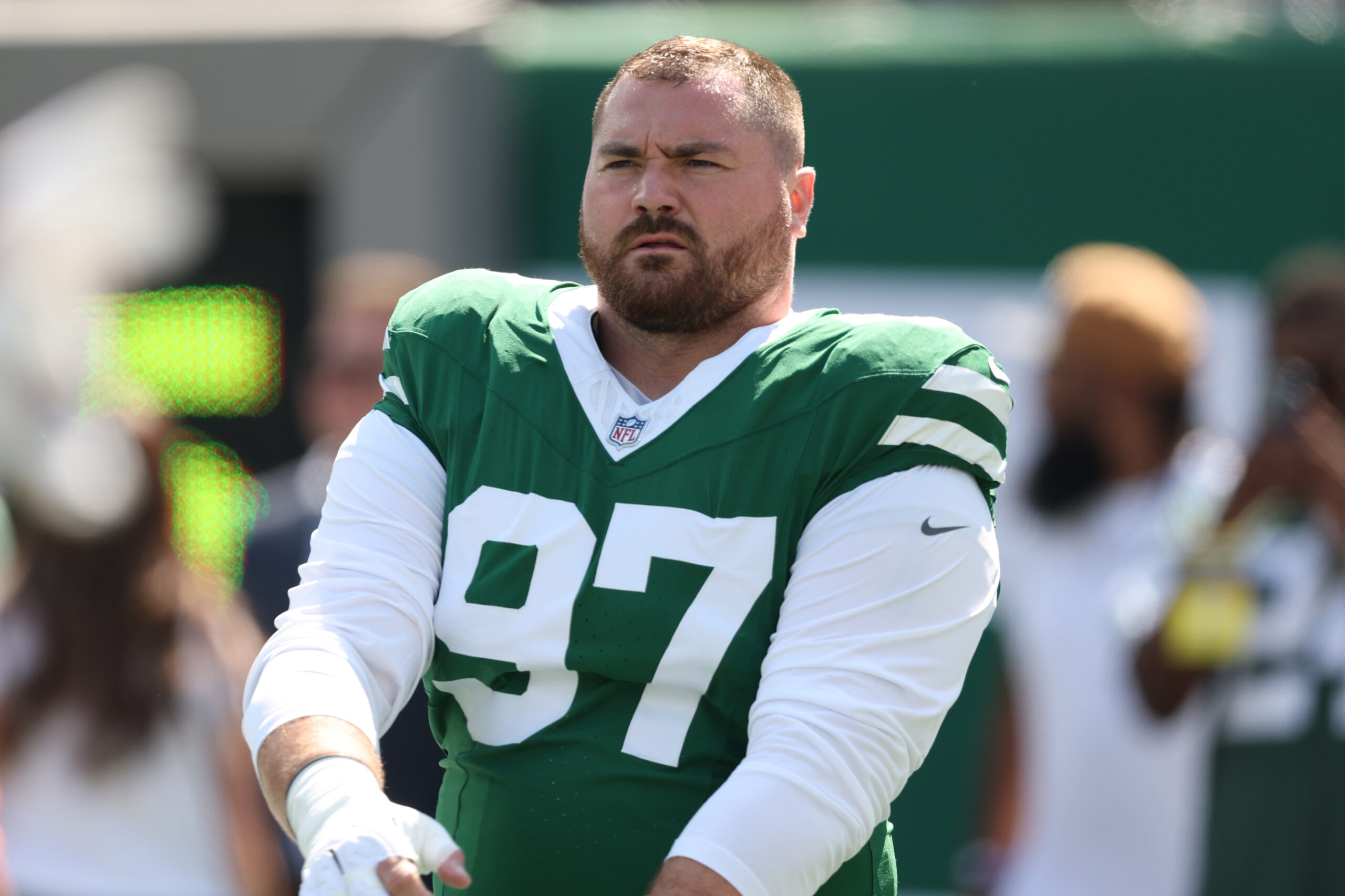 Sep 14, 2025; East Rutherford, New Jersey, USA; New York Jets defensive tackle Harrison Phillips (97) before the game against the Buffalo Bills at MetLife Stadium. Mandatory Credit: Vincent Carchietta-Imagn Images