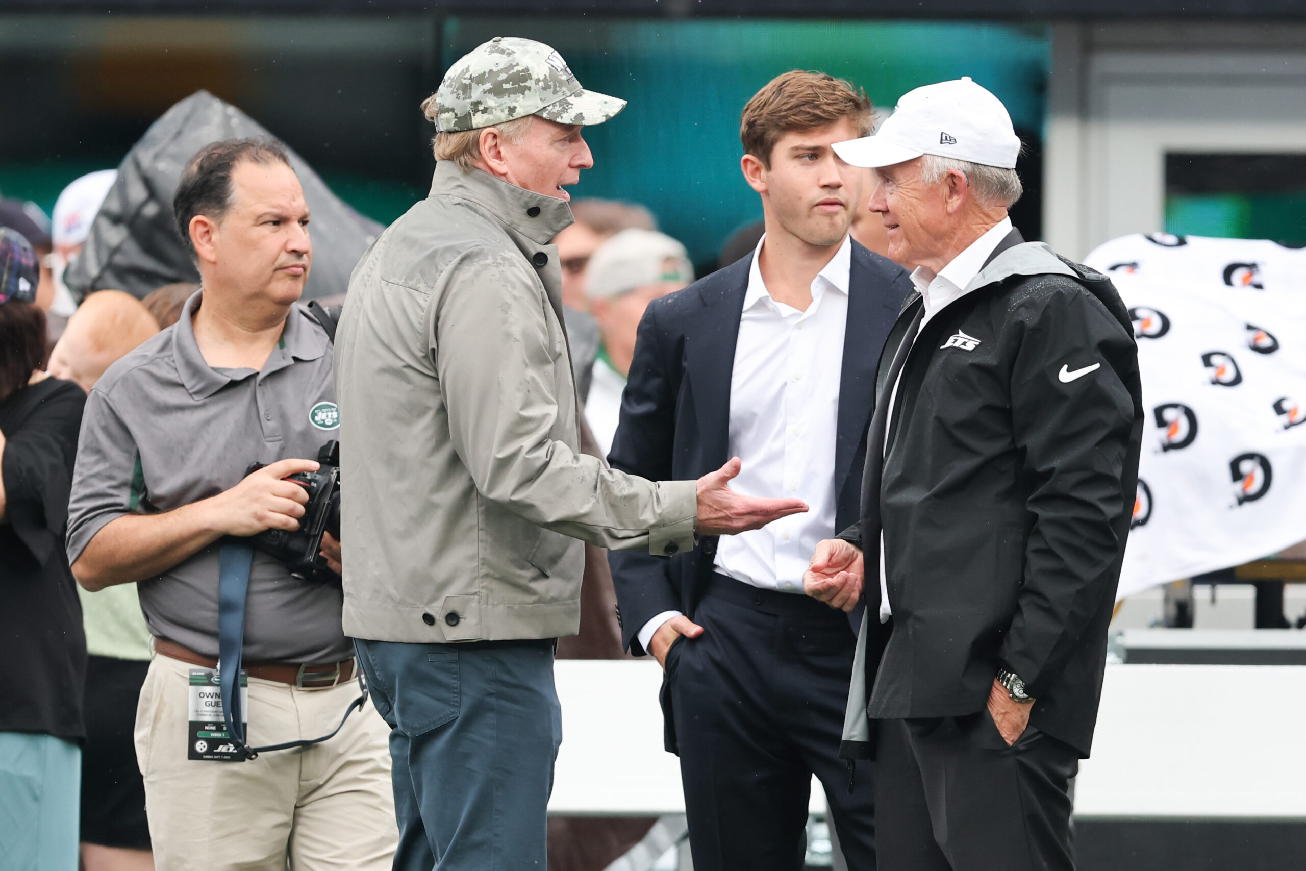 Sep 7, 2025; East Rutherford, New Jersey, USA; NFL Commissioner Roger Goodell greets New York Jets owner Woody Johnson and his son before the game against the Pittsburgh Steelers at MetLife Stadium. Mandatory Credit: Vincent Carchietta-Imagn Images