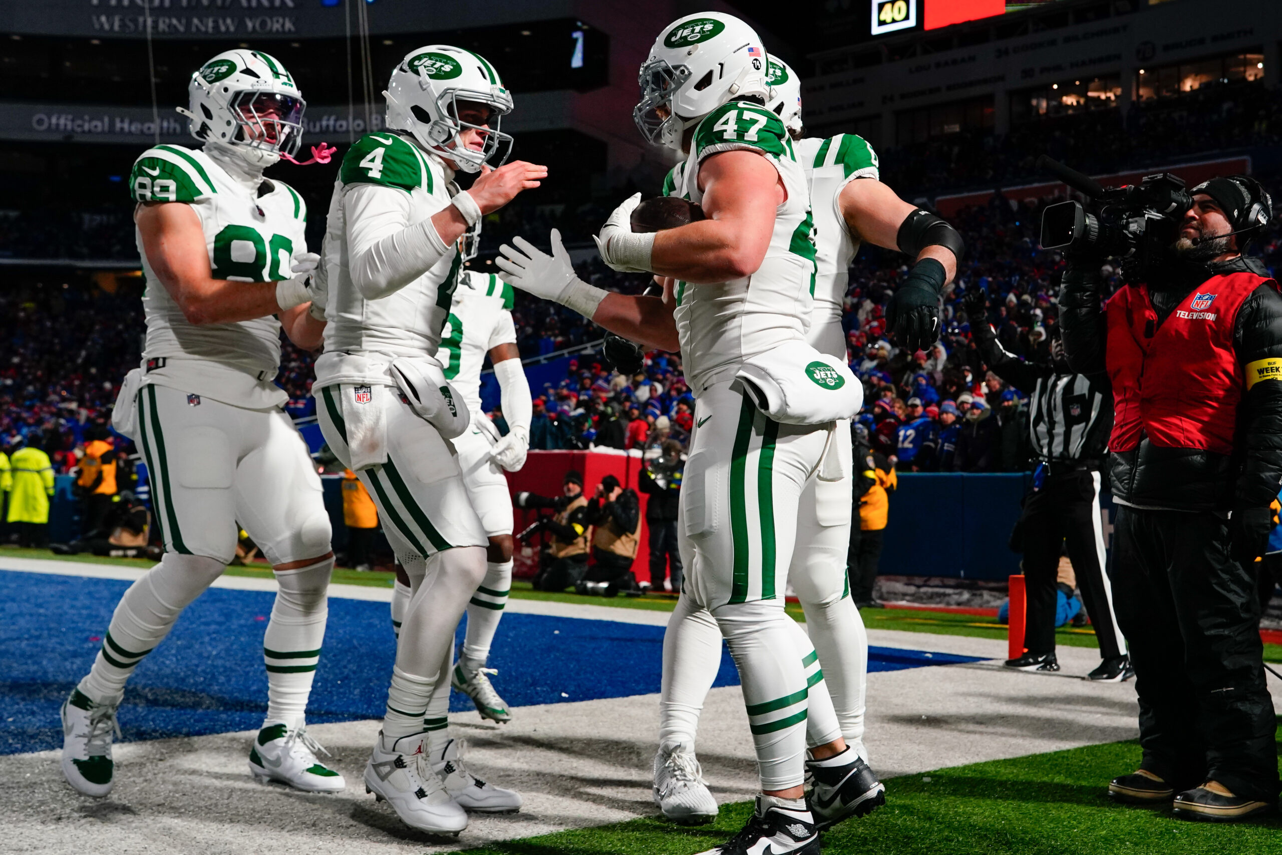 Jan 4, 2026; Orchard Park, New York, USA; New York Jets quarterback Brady Cook (4) and fullback Andrew Beck (47) celebrate after a touchdown against the Buffalo Bills during the fourth quarter at Highmark Stadium. Mandatory Credit: Gregory Fisher-Imagn Images