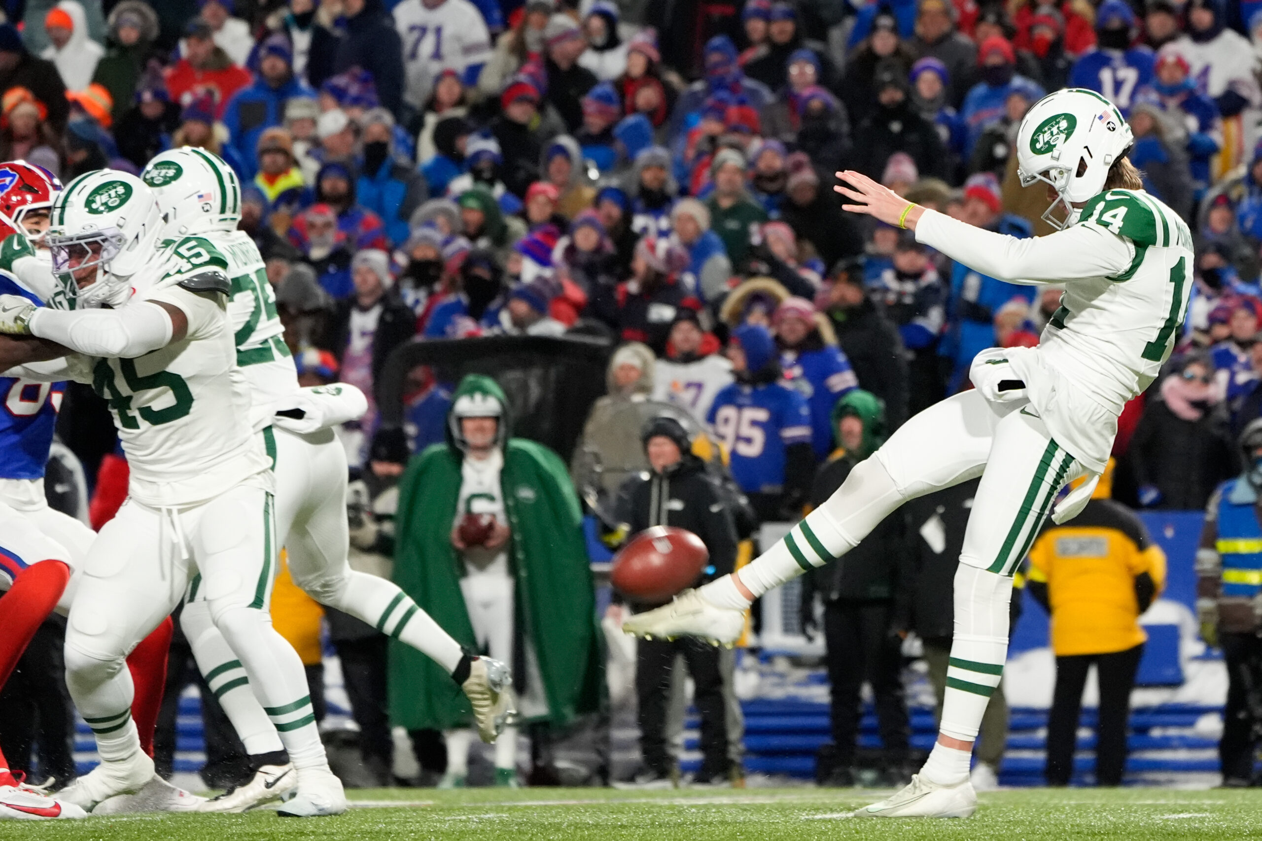 Jan 4, 2026; Orchard Park, New York, USA; New York Jets punter Austin McNamara (14) punts the ball against the Buffalo Bills during the third quarter at Highmark Stadium. Mandatory Credit: Gregory Fisher-Imagn Images