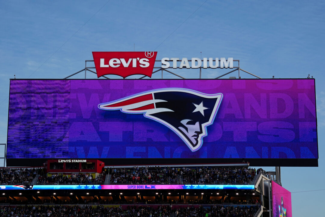 Feb 8 2026 Santa Clara CA USA The New England Patriots logo is shown during the game in Super Bowl LX at Levi s Stadium Mandatory Credit Darren Yamashita-Imagn Images