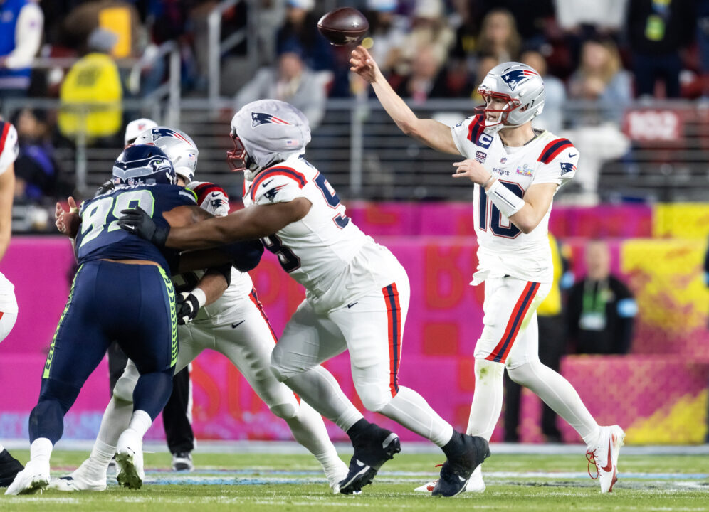 Feb 8 2026 Santa Clara CA USA New England Patriots quarterback Drake Maye 10 against the Seattle Seahawks during Super Bowl LX at Levi s Stadium Mandatory Credit Mark J Rebilas-Imagn Images
