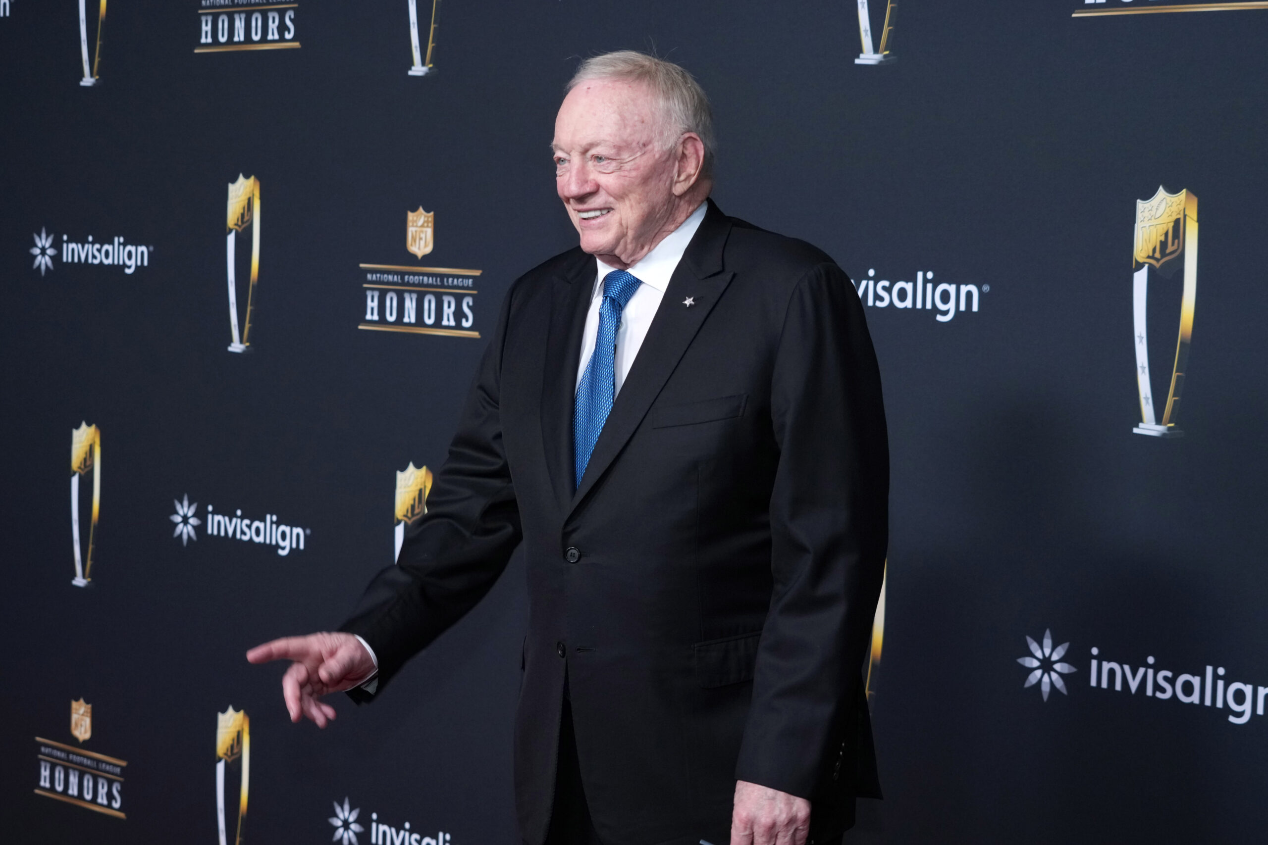 Feb 5, 2026; San Francisco, CA, USA; Dallas Cowboys owner Jerry Jones poses on the NFL Honors Red Carpet before Super Bowl LX at Palace of Fine Arts. Mandatory Credit: Kirby Lee-Imagn Images