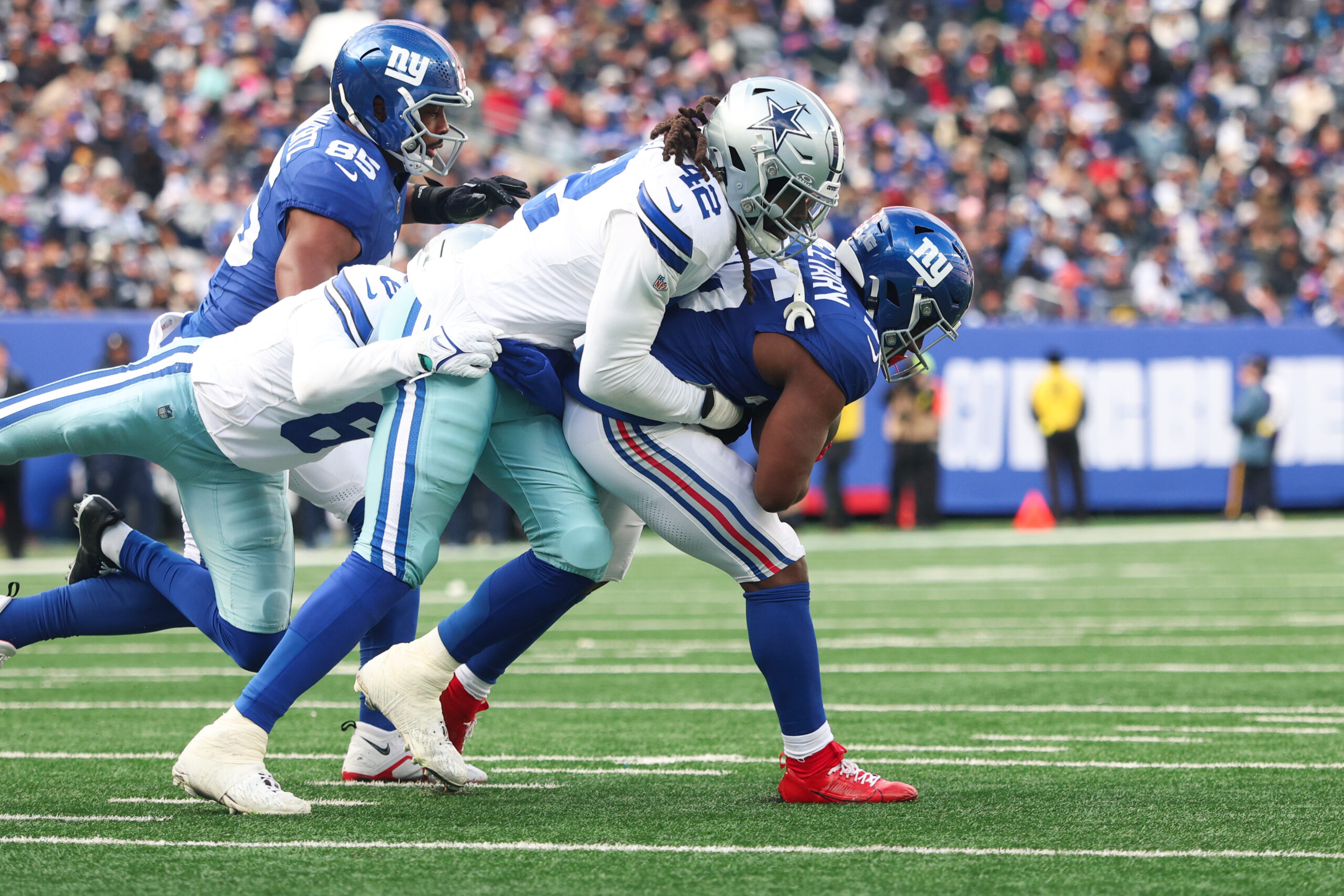 Jan 4, 2026; East Rutherford, New Jersey, USA; Dallas Cowboys defensive end Jadeveon Clowney (42) and Dallas Cowboys safety Donovan Wilson (6) tackle New York Giants running back Devin Singletary (26) during the second quarter at MetLife Stadium. Mandatory Credit: Vincent Carchietta-Imagn Images