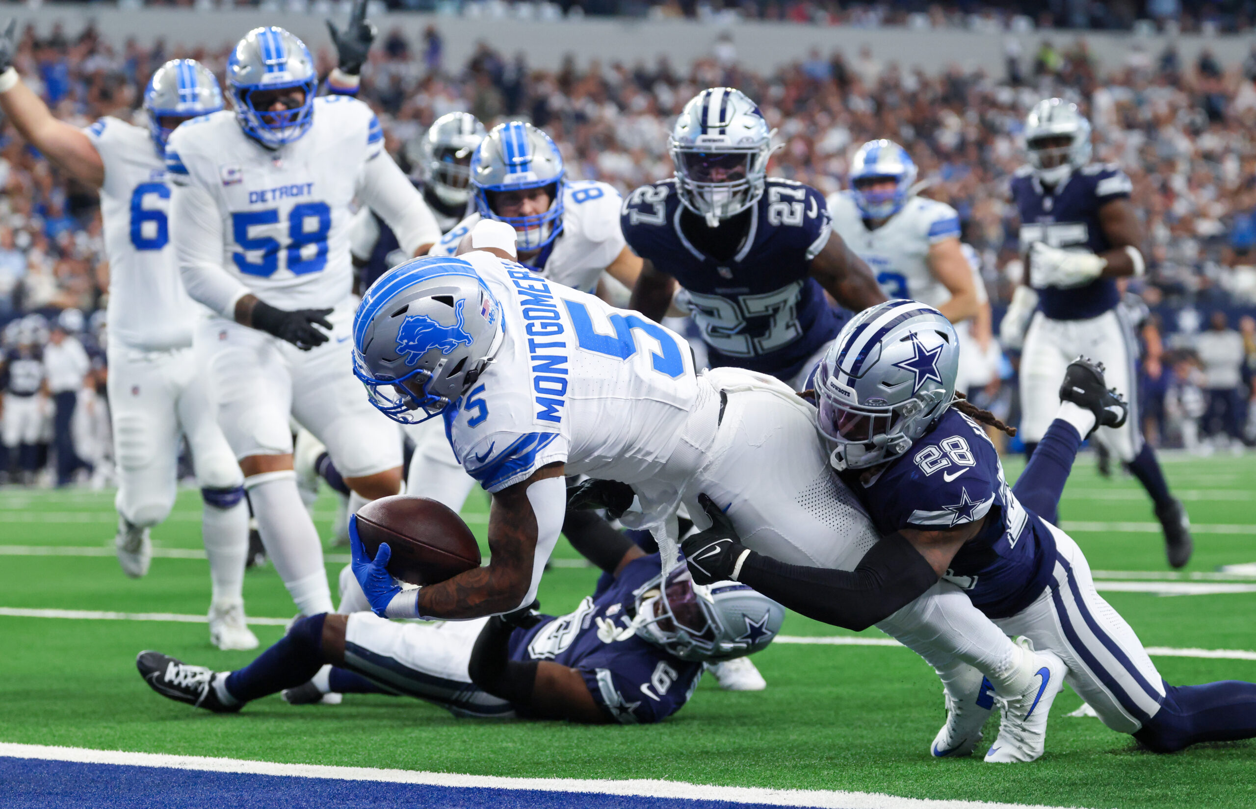 Oct 13, 2024; Arlington, Texas, USA; Detroit Lions running back David Montgomery (5) dives for a touchdown as Dallas Cowboys safety Malik Hooker (28) defends during the first quarter at AT&T Stadium. Mandatory Credit: Kevin Jairaj-Imagn Images