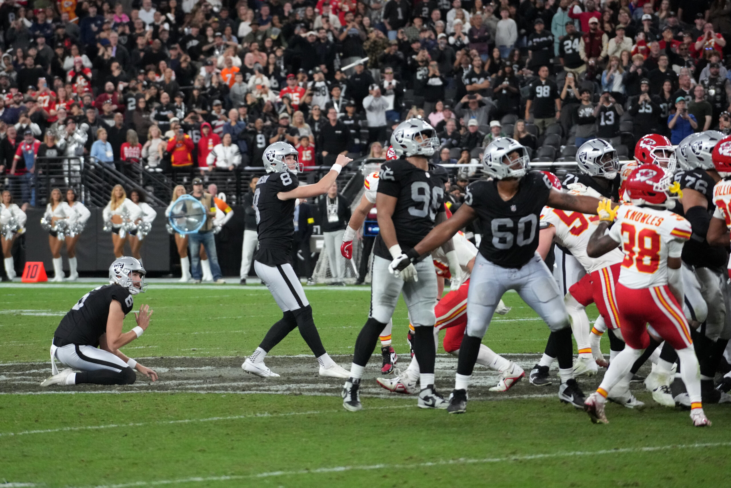 Jan 4, 2026; Paradise, Nevada, USA; Las Vegas Raiders place kicker Daniel Carlson (8) kicks a 60-yard field goal out of the hold of punter AJ Cole (6) with eight seconds left against the Kansas City Chiefs at Allegiant Stadium. Mandatory Credit: Kirby Lee-Imagn Images