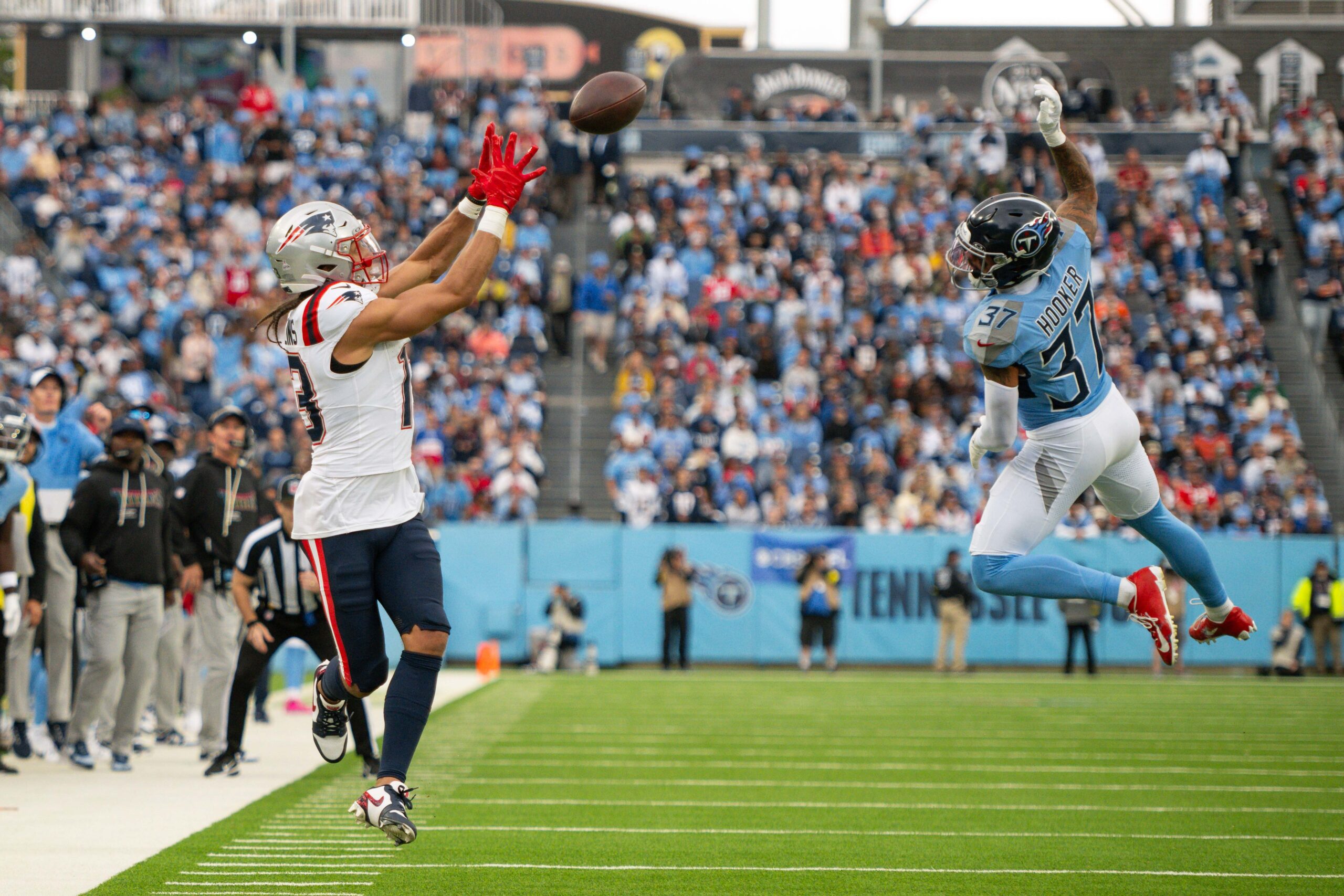 Oct 19, 2025; Nashville, Tennessee, USA; New England Patriots wide receiver Mack Hollins (13) makes a catch over Tennessee Titans safety Amani Hooker (37) during the first half at Nissan Stadium. Mandatory Credit: Steve Roberts-Imagn Images
