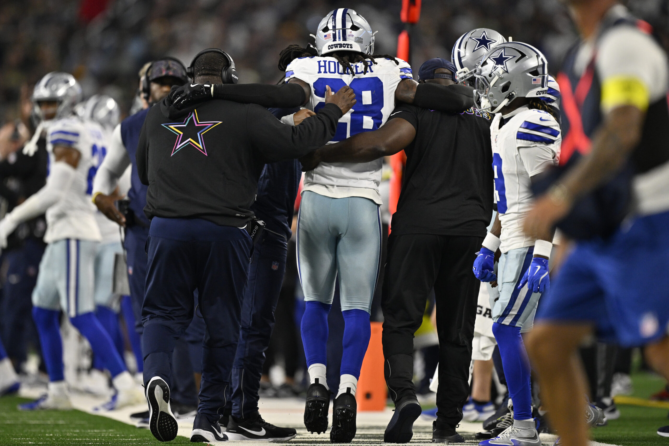 Sep 28, 2025; Arlington, Texas, USA; Dallas Cowboys safety Malik Hooker (28) is helped off the field in the second quarter against the Green Bay Packers at AT&T Stadium. Mandatory Credit: Jerome Miron-Imagn Images