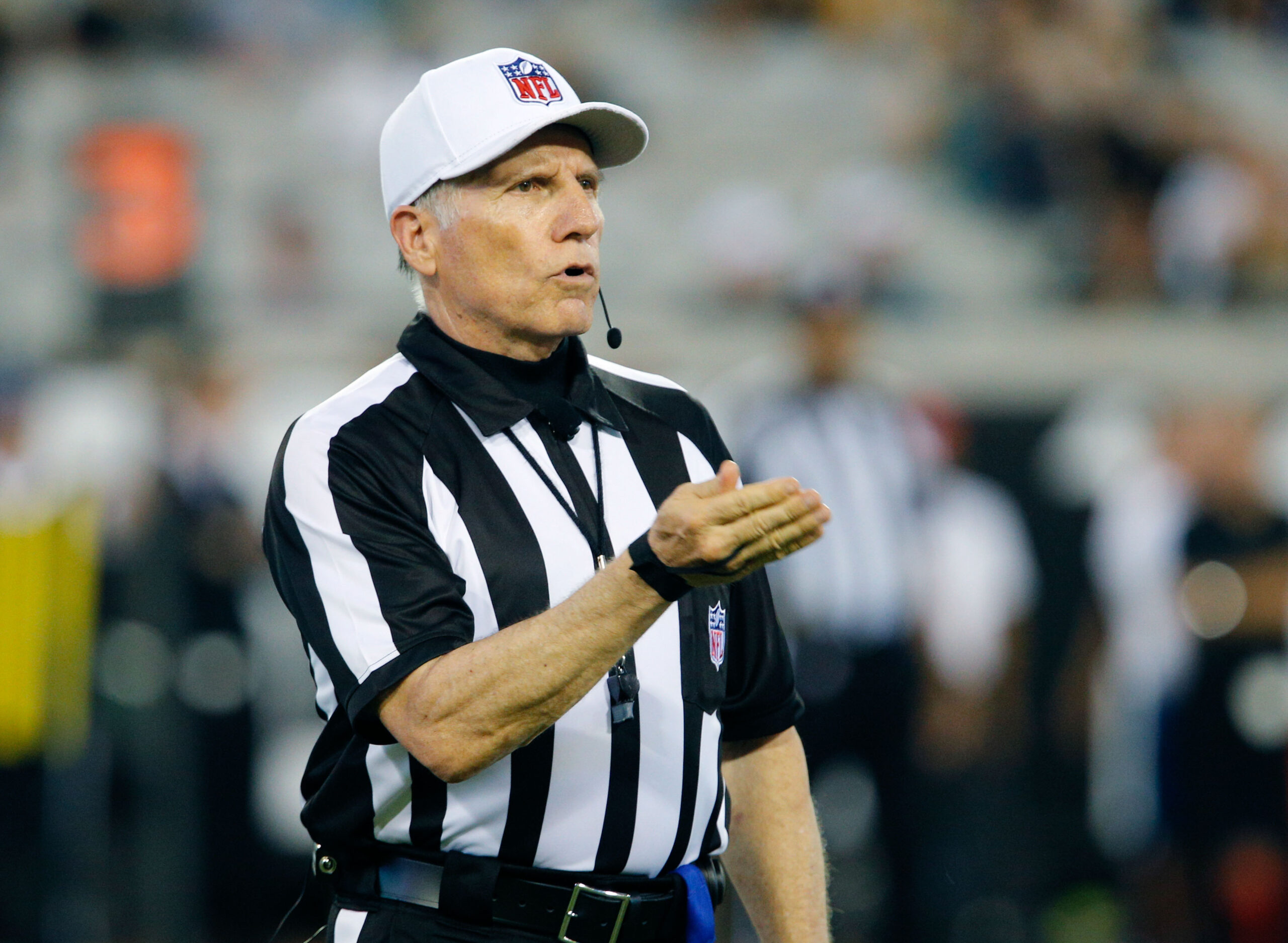 Aug 9, 2018; Jacksonville, FL, USA; NFL referee Walt Anderson (66) announces a penalty during the second half between the Jacksonville Jaguars and the New Orleans Saints at TIAA Bank Field. Mandatory Credit: Reinhold Matay-Imagn Images