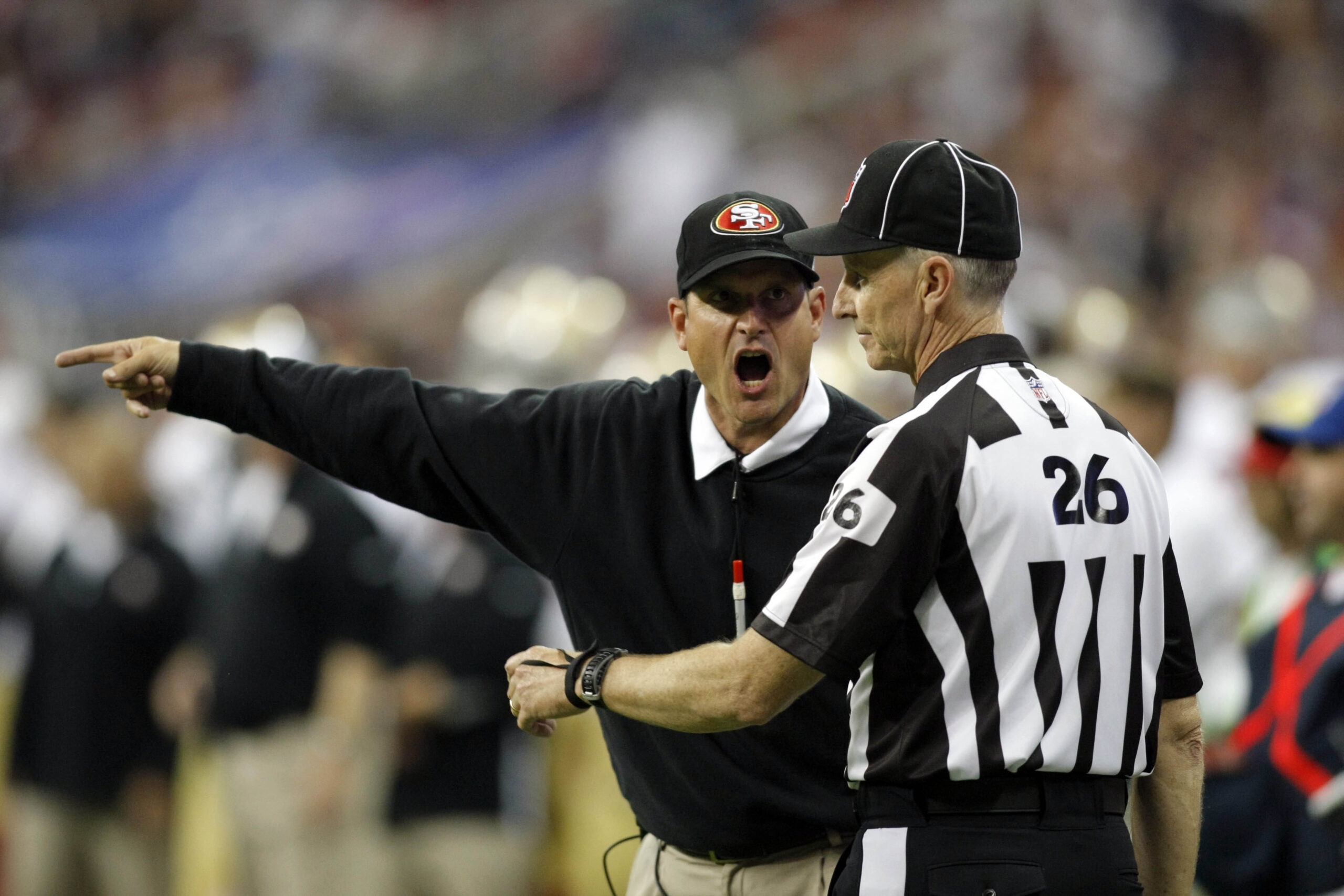 Aug 18, 2012; Houston, TX, USA; San Francisco 49ers head coach Jim Harbaugh yells at field judge Lance Easley against the Houston Texans in the second quarter at Reliant Stadium. Mandatory Credit: Brett Davis-Imagn Images