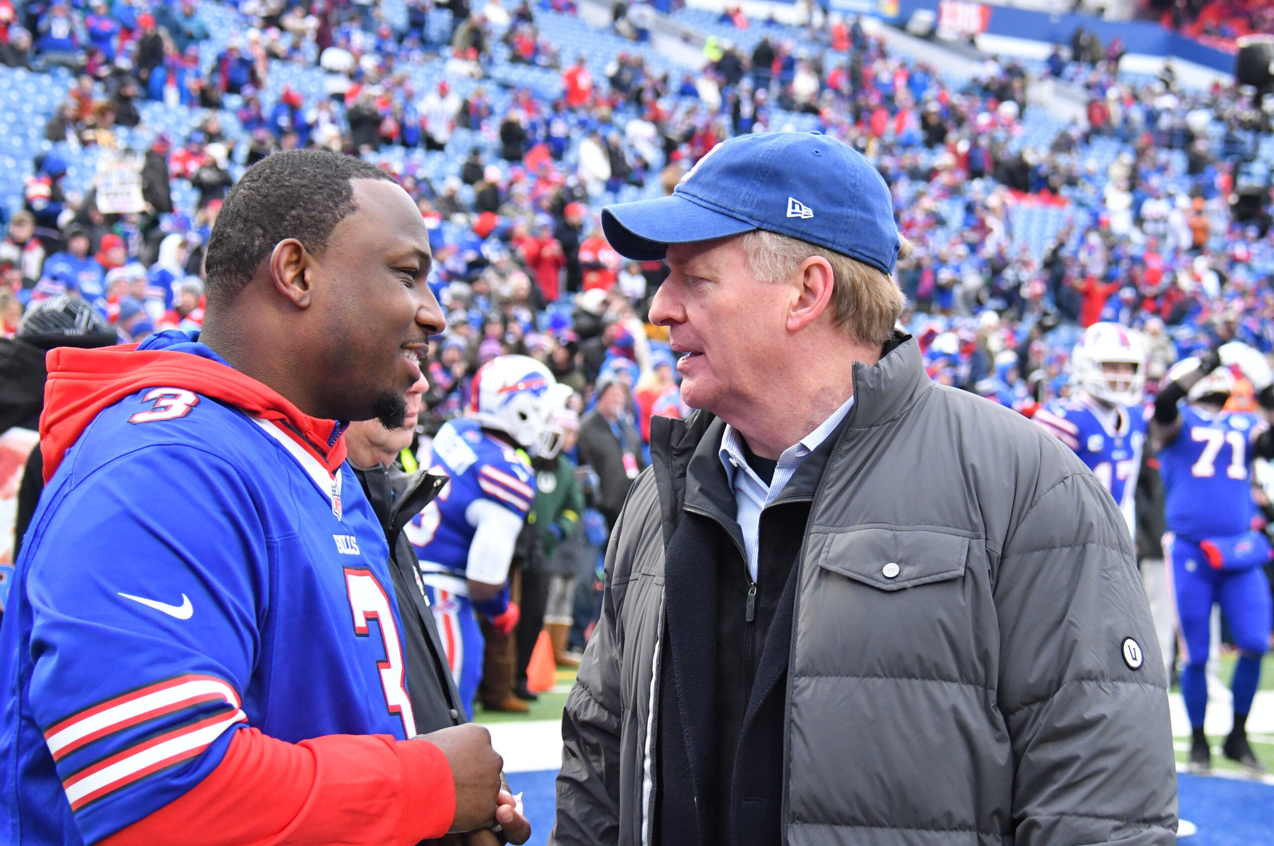 Jan 8, 2023; Orchard Park, New York, USA; NFL Commissioner Roger Goodell meets former Buffalo Bills running back LeSean McCoy who wears a Damar Hamlin #3 jersey before a game against the New England Patriots at Highmark Stadium. Mandatory Credit: Mark Konezny-Imagn Images