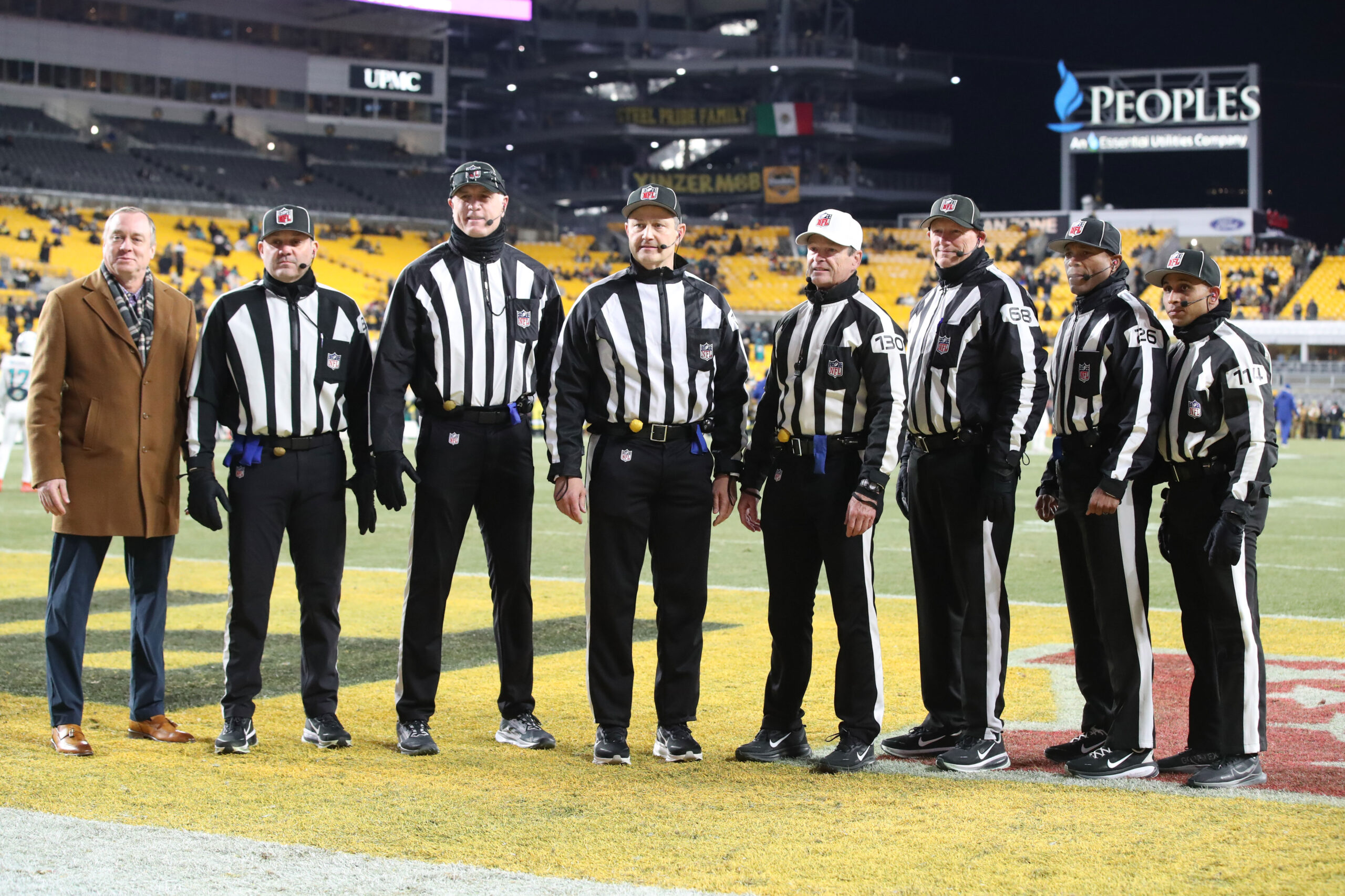 Dec 15, 2025; Pittsburgh, Pennsylvania, USA; The NFL officiating crew assigned to the game between the Miami Dolphins and the Pittsburgh Steelers at Acrisure Stadium. Mandatory Credit: Charles LeClaire-Imagn Images