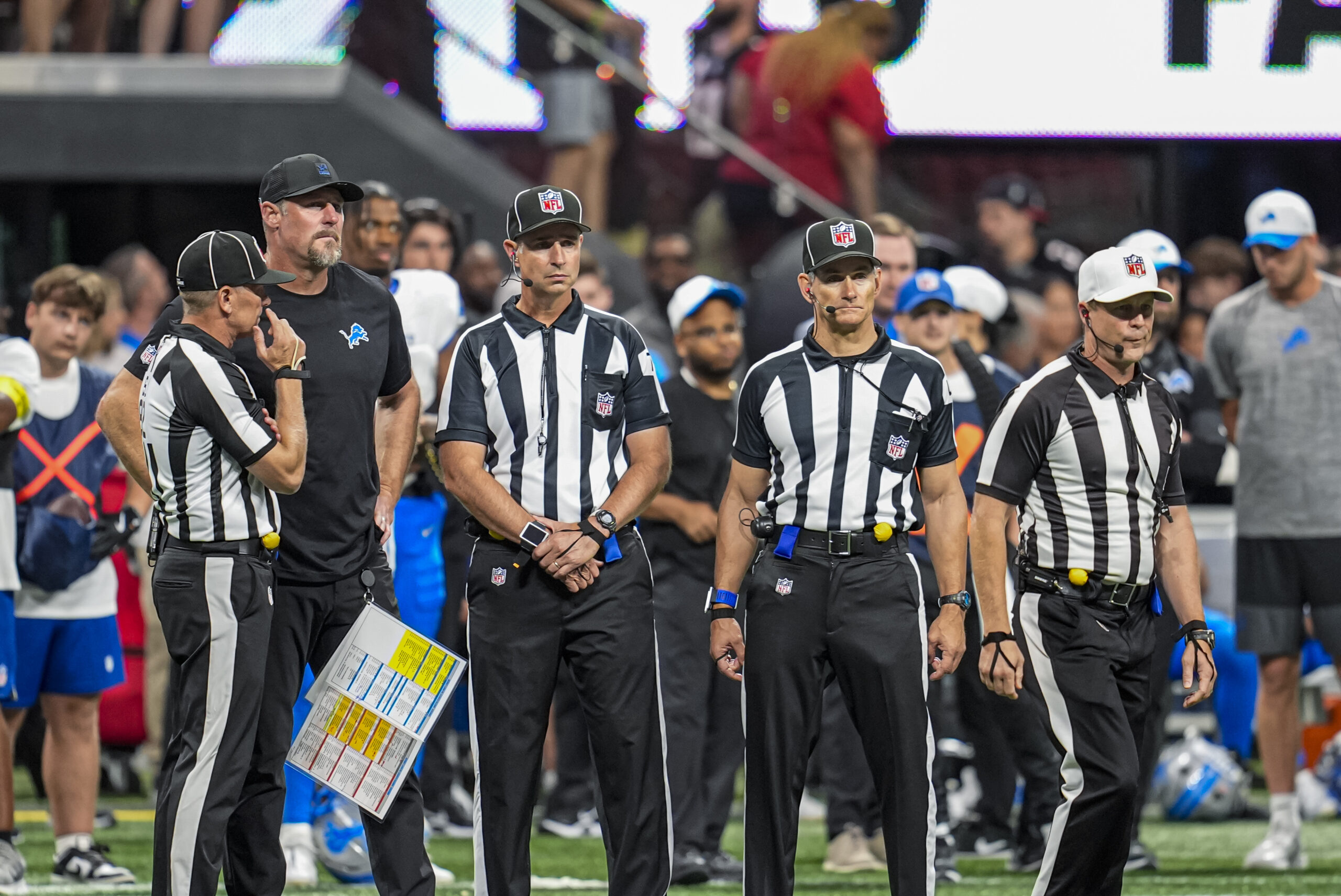 Aug 8, 2025; Atlanta, Georgia, USA; Detroit Lions head coach Dan Campbell talks with officials after an injury to safety Morice Norris (26) (not shown) during the game against the Atlanta Falcons at Mercedes-Benz Stadium. Mandatory Credit: Dale Zanine-Imagn Images