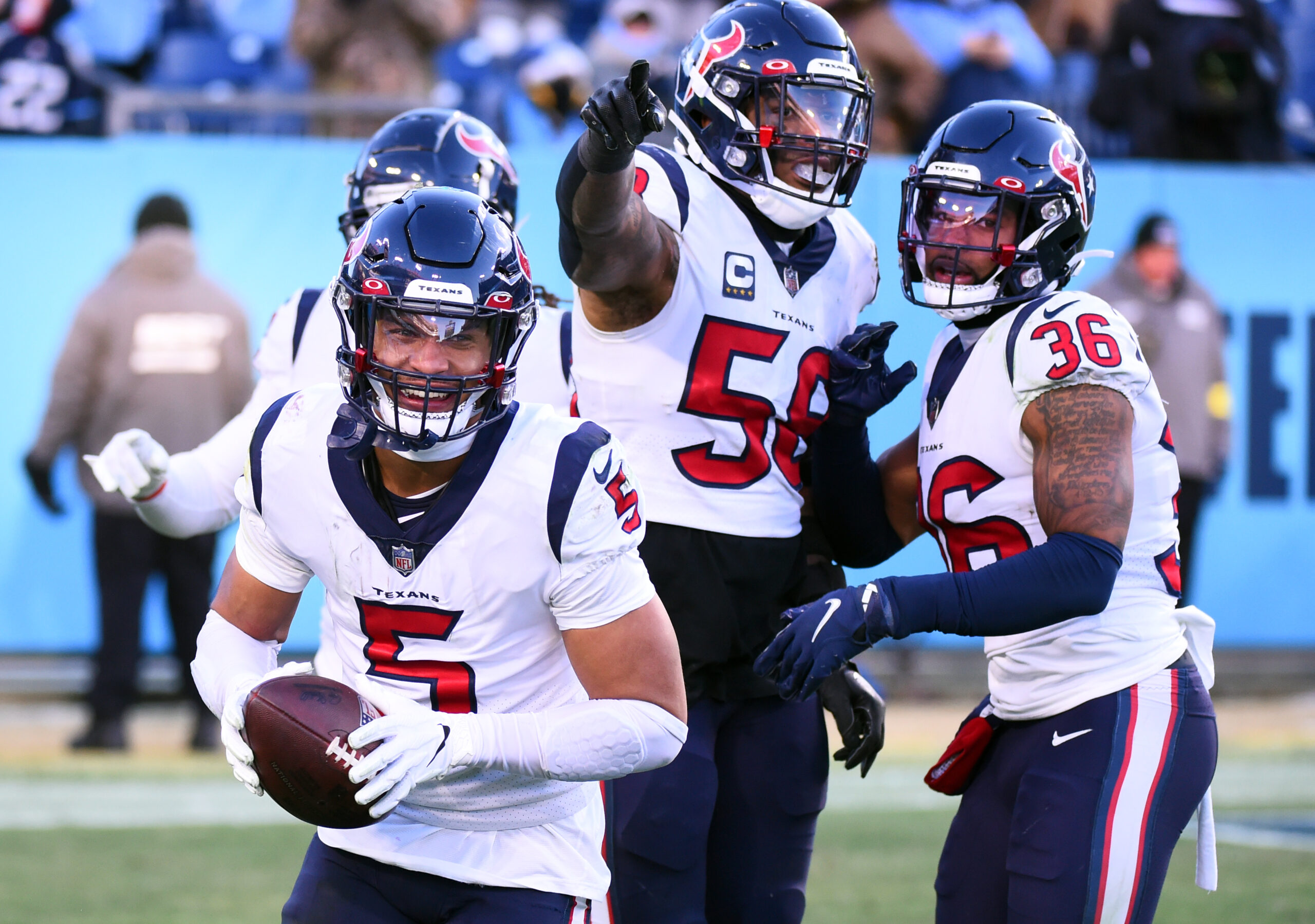 Dec 24, 2022; Nashville, Tennessee, USA; Houston Texans safety Jalen Pitre (5) celebrates after intercepting a Hail Mary attempt to end the game against the Tennessee Titans at Nissan Stadium. Mandatory Credit: Christopher Hanewinckel-Imagn Images