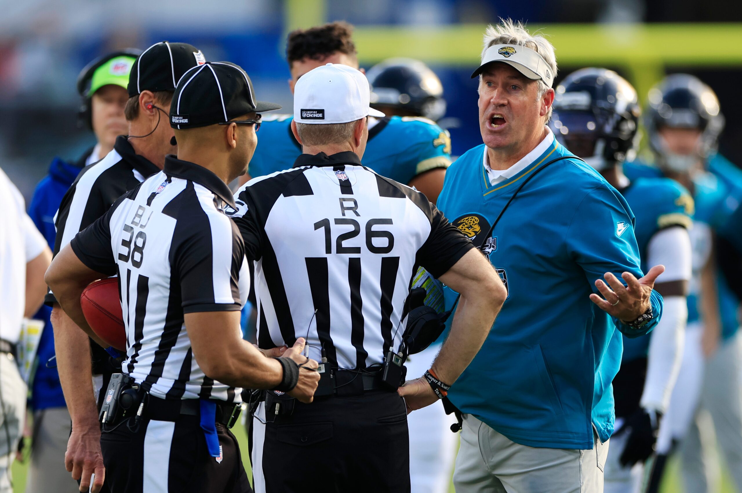 Jacksonville Jaguars head coach Doug Pederson argues with the officials on a failed two-point conversion during the fourth quarter Sunday, Dec. 15, 2024 at EverBank Stadium in Jacksonville, Fla. The Jets held off the Jaguars 32-25. [Corey Perrine/Florida Times-Union]