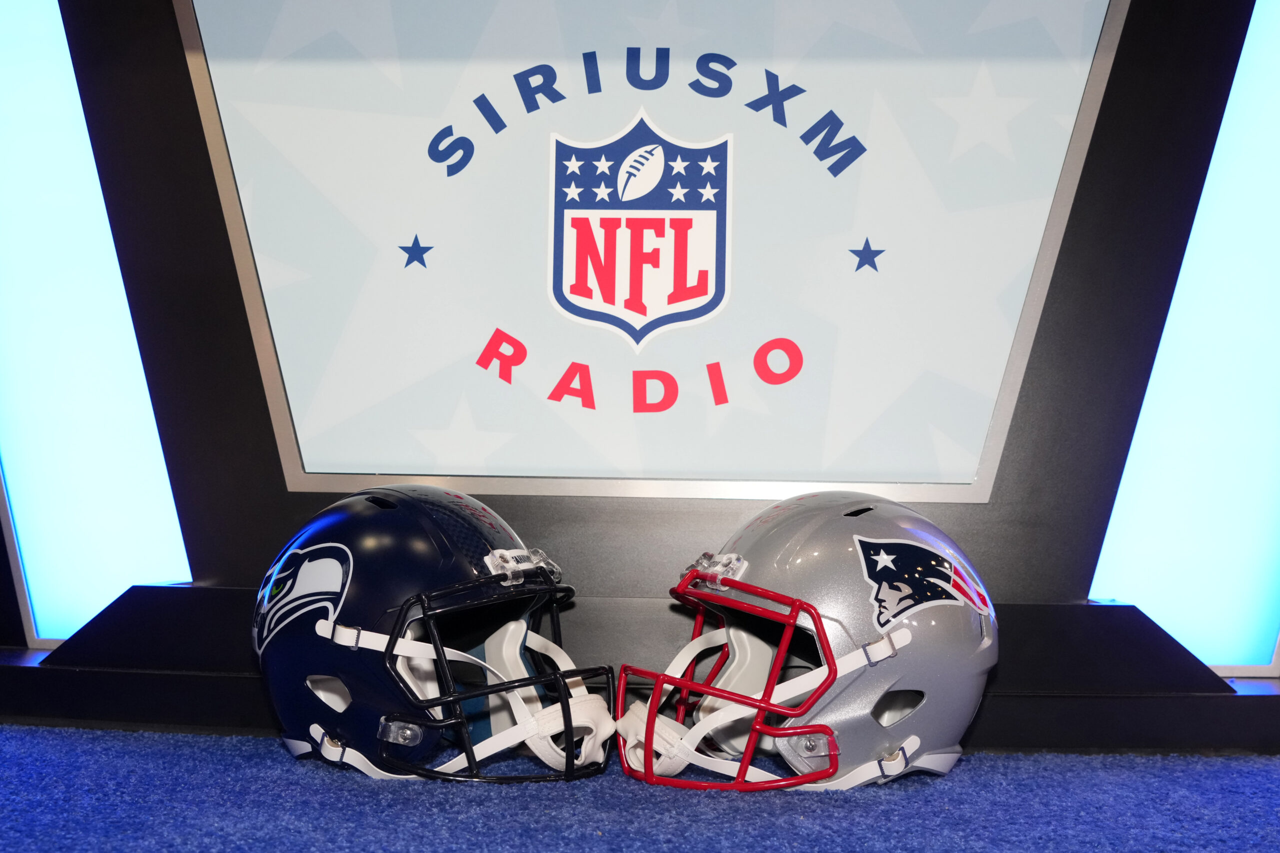 Feb 3, 2026; San Francisco, CA, USA; Seattle Seahawks and New England Patriots helmets on the SiriusXM NFL radio set at the Super Bowl LX media center at the Moscone Center. Mandatory Credit: Kirby Lee-Imagn Images