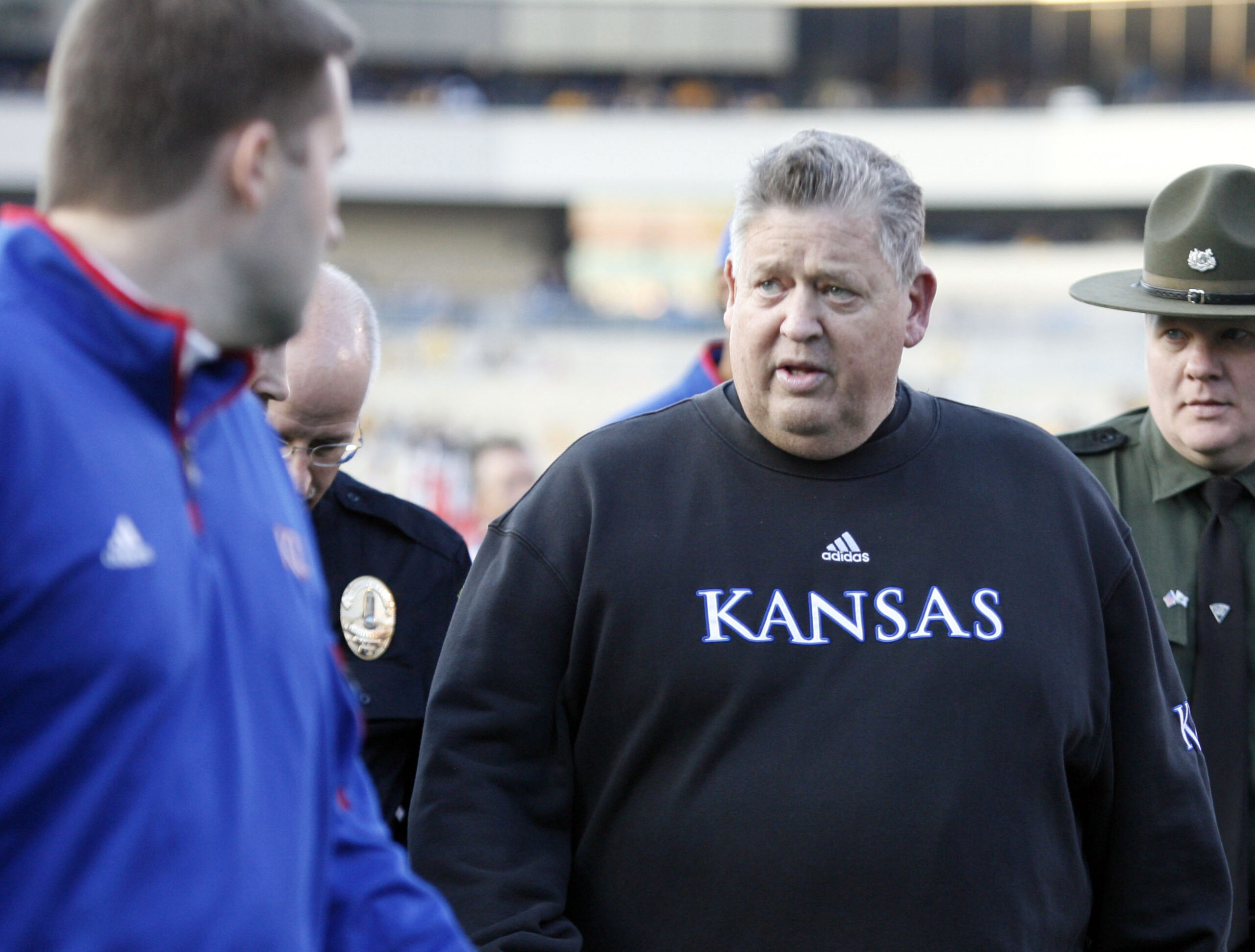 December 1, 2012; Morgantown, WV, USA; Kansas Jayhawks head coach Charlie Weis (right) reacts as he departs the field at half time against the West Virginia Mountaineers during the second quarter at Milan Puskar Stadium. The West Virginia Mountaineers won 59-10. Mandatory Credit: Charles LeClaire-Imagn Images