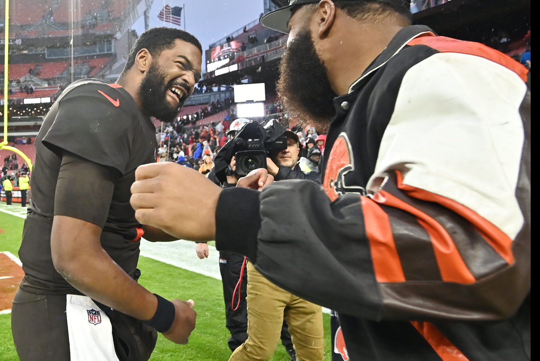 Nov 27, 2022; Cleveland, Ohio, USA; Cleveland Browns quarterback Jacoby Brissett (7) celebrates with linebacker Anthony Walker Jr. (5) after the Browns beat the Tampa Bay Buccaneers at FirstEnergy Stadium. Mandatory Credit: Ken Blaze-Imagn Images