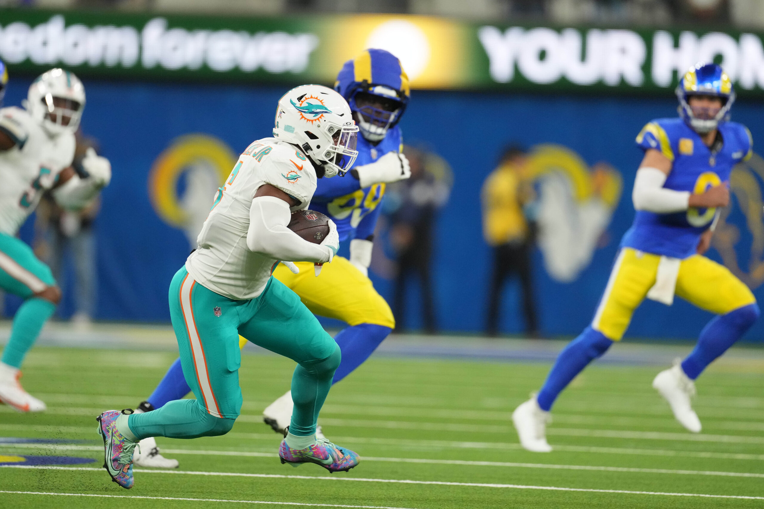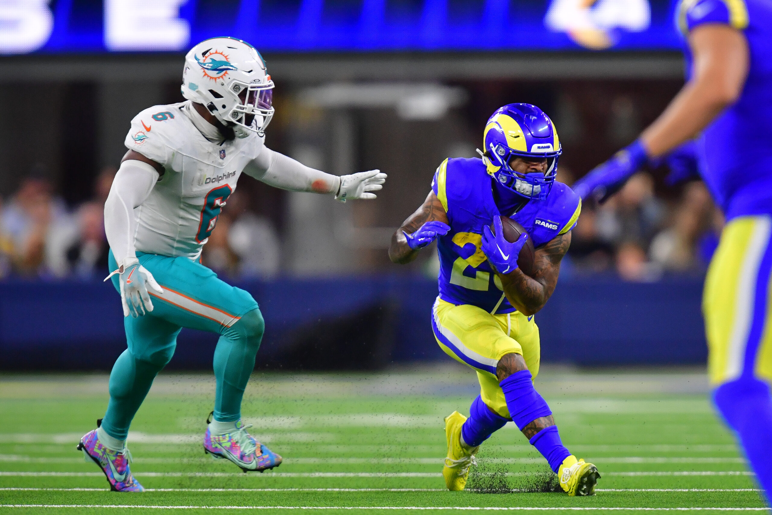 Nov 11, 2024; Inglewood, California, USA; Los Angeles Rams running back Kyren Williams (23) runs the ball Miami Dolphins linebacker Anthony Walker Jr. (6) during the first half at SoFi Stadium. Mandatory Credit: Gary A. Vasquez-Imagn Images