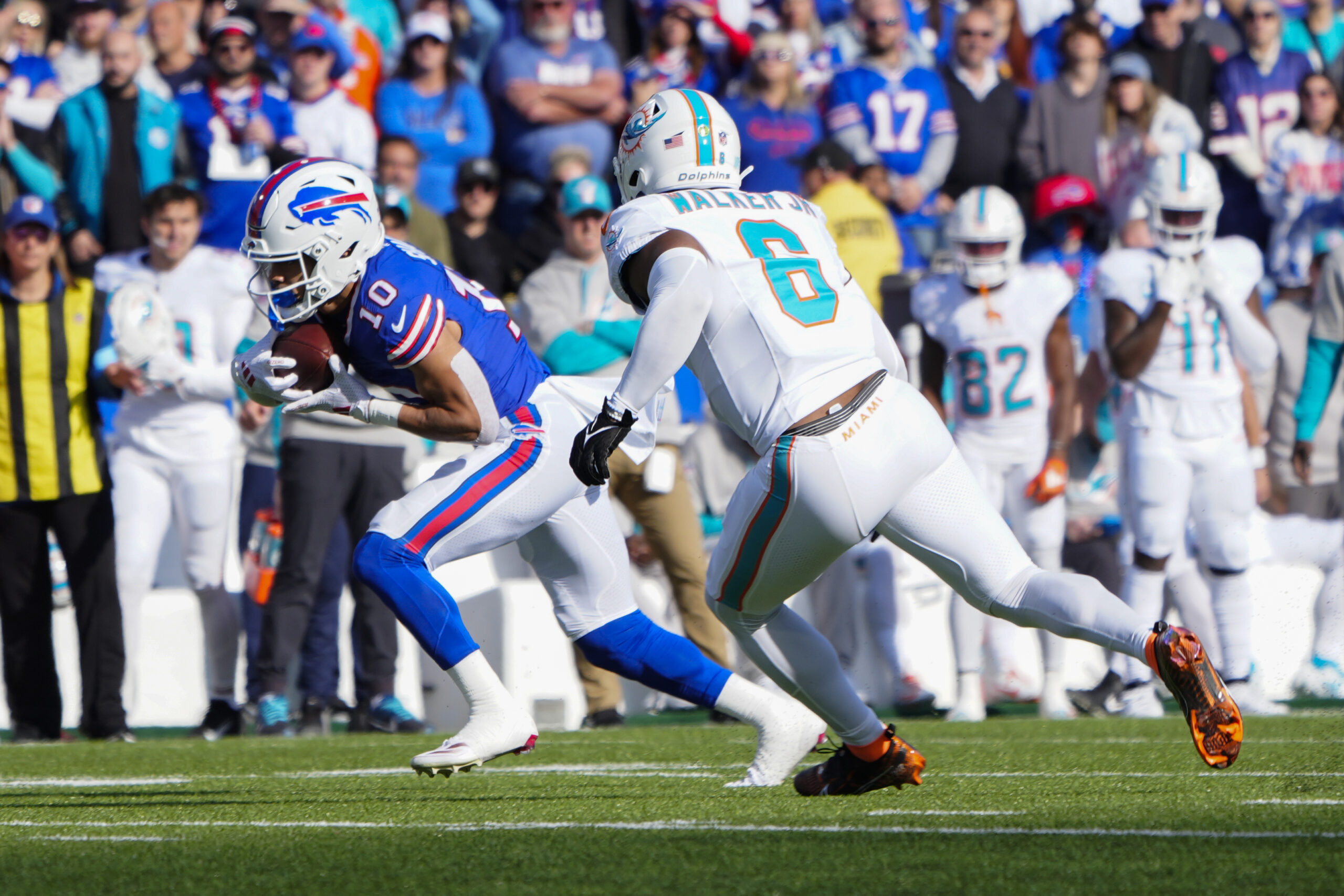Nov 3, 2024; Orchard Park, New York, USA; Buffalo Bills wide receiver Khalil Shakir (10) makes a catch against Miami Dolphins linebacker Anthony Walker Jr. (6) during the first half at Highmark Stadium. Mandatory Credit: Gregory Fisher-Imagn Images