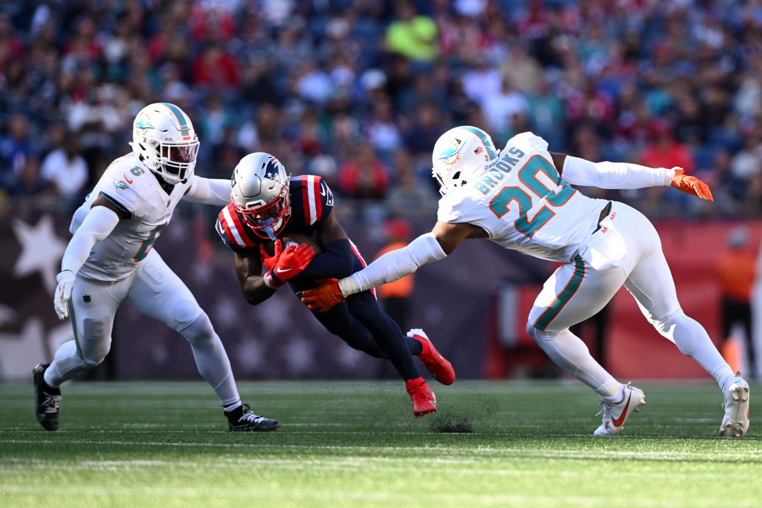 Oct 6, 2024; Foxborough, Massachusetts, USA; New England Patriots wide receiver DeMario Douglas (3) rushes against Miami Dolphins linebacker Anthony Walker Jr. (6) and linebacker Jordyn Brooks (20) during the second half at Gillette Stadium. Mandatory Credit: Brian Fluharty-Imagn Images