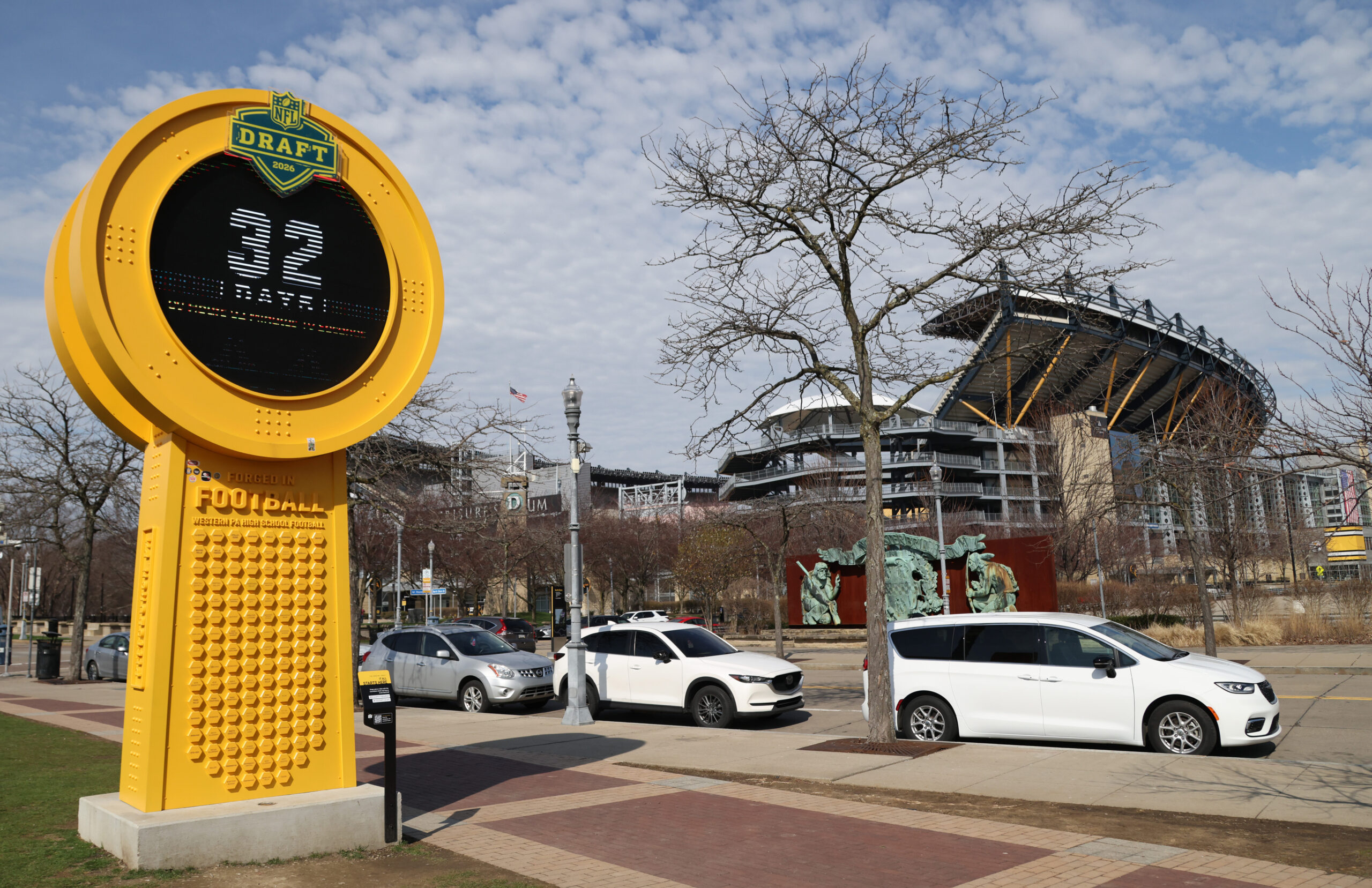 Mar 22, 2026; Pittsburgh, Pennsylvania, USA; View of the Draft Day countdown clock outside of Acrisure Stadium site of the 2025 NFL Draft before the Pittsburgh Penguins host the Carolina Hurricanes at PPG Paints Arena. Mandatory Credit: Charles LeClaire-Imagn Images